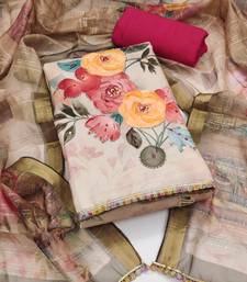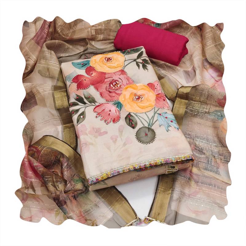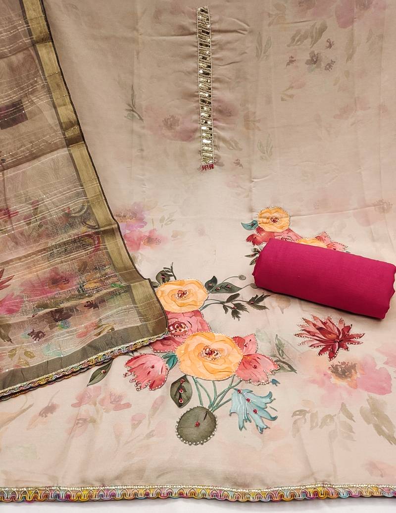Regal Heavy Digital Print Moti Sequence Handwork And Fancy Border With Designer Dupatta Straight Style 2.20 Mtr Unstitched Dress Material Top Of Beige Colour Pure Jaam Cotton Fabric Also Including 2.40 Mtr Chudidar Style Bottom Piece Material Of Pink Colour Rayon Fabric With 2.10 Mtr Dupatta Of Multi Colour Soft Organja Fabric By Shadow & Saining Brand