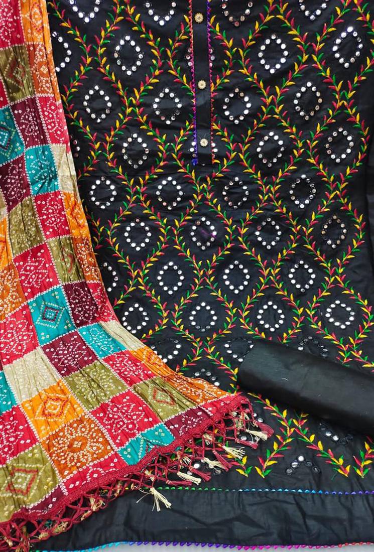 | Product Description | Charming Heavy Multi Thread Embroidery And Mirror Work With Bandhani Print Dupatta Straight Style 1.80 Mtr Unstitched Dress Material Top Of Black Colour Cotton Fabric Suggestable Quarter Style Sleeves And Round Style Neck Also Including 2.00 Mtr Chudidar Style Bottom Piece Material Of Black Colour Cotton Fabric With 2.00 Mtr Dupatta Of Multi Colour Chinon Fabric |