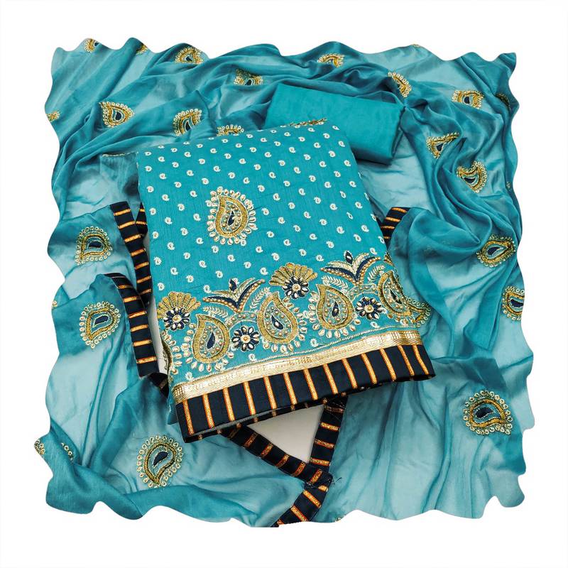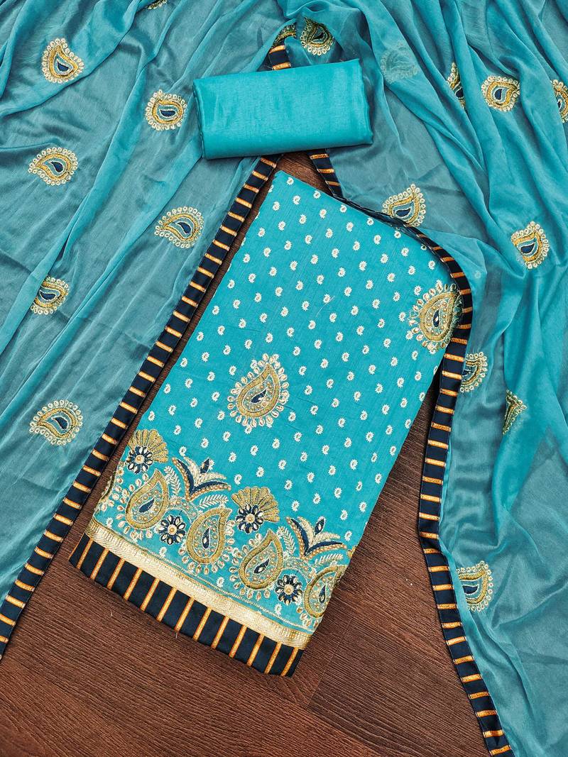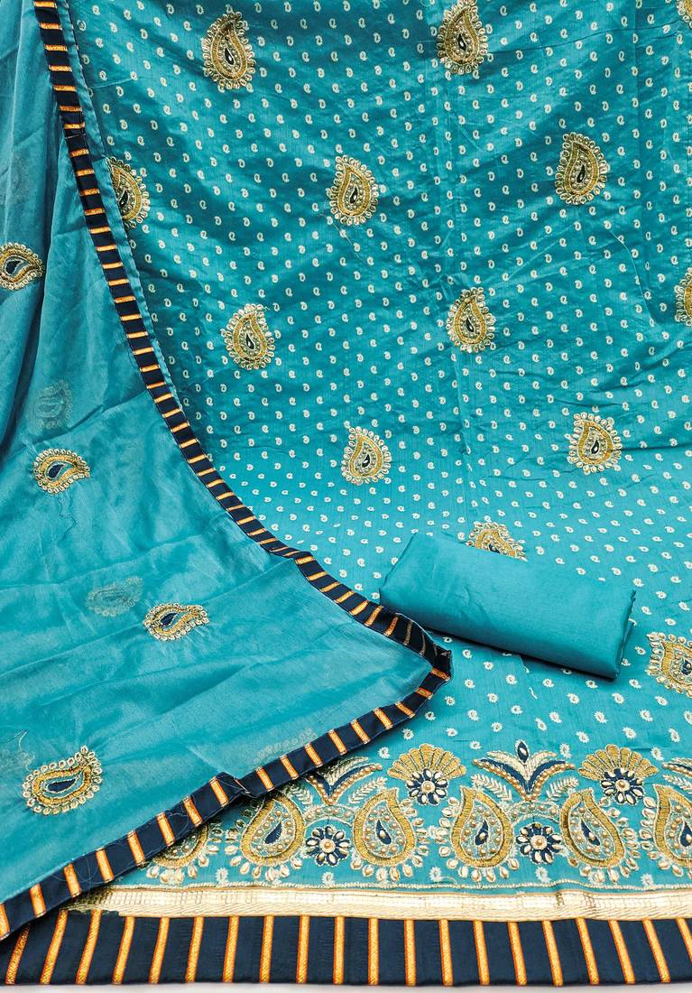 | Product Description | Bestseller Designer Print Heavy Embroidery And Fancy Border With Embroidered Dupatta Straight Style 2.00 Mtr Unstitched Dress Material Top Of Blue Colour Chanderi Modal Cotton Fabric With 2 Mtr Dull Santoon As Lining Inner Fabric Also Including 3.80 Mtr Unstiched Bottom Material Of Blue Colour Dull Santoon Fabric With 2.10 Mtr Dupatta Of Blue Colour Nazneen Fabric By Shadow & Saining Brand |