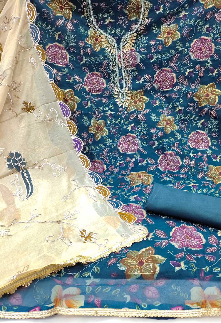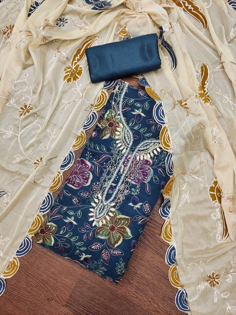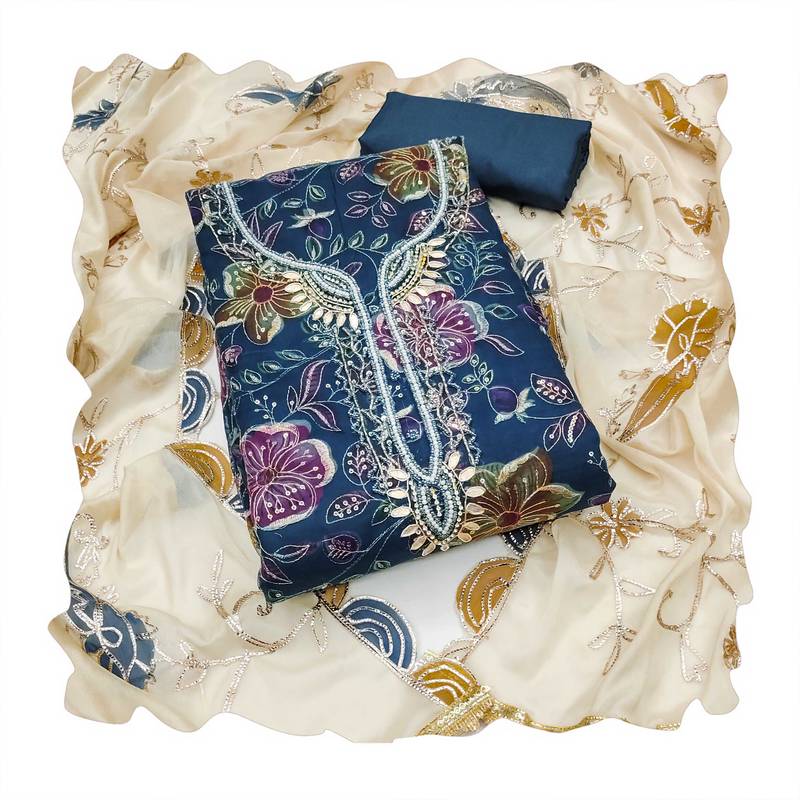 | Product Description | New Arrival Heavy Thread Sequence Embroidered And Fancy Border With Designer Burs Embroidered Dupatta Straight Style 2.00 Mtr Unstitched Dress Material Top Of Blue Colour Viscose Organja Fabric With 2 Mtr Dull Santoon As Lining Inner Fabric Also Including 3.80 Mtr Unstiched Bottom Material Of Blue Colour Dull Santoon Fabric With 2.10 Mtr Dupatta Of Multi Colour Nazneen Fabric By Shadow & Saining Brand |