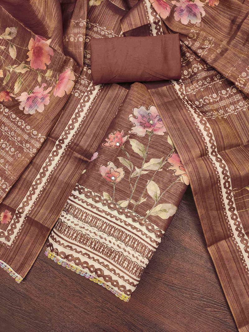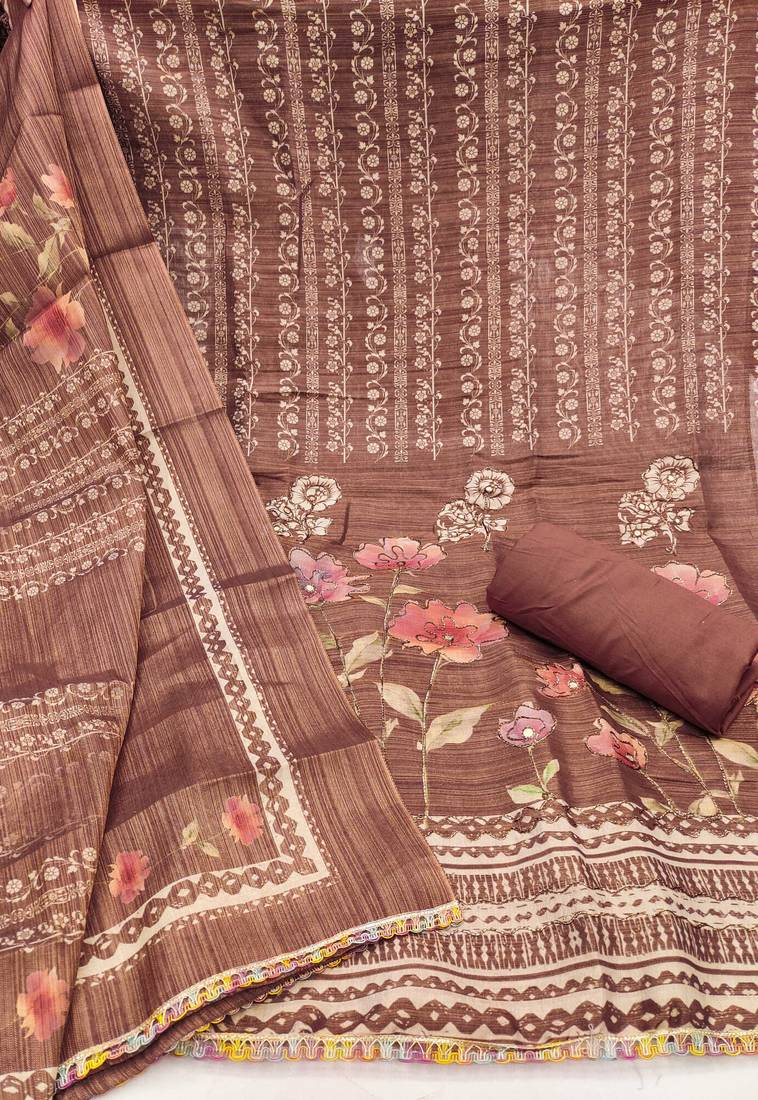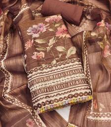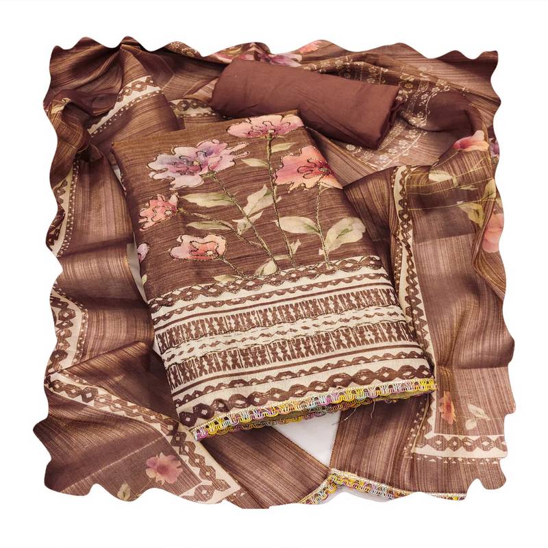 | Product Description | Artisanal Designer Print Embroidery And Fancy Border With Stylish Printed Dupatta Straight Style 2.00 Mtr Unstitched Dress Material Top Of Brown Colour Simmer Cotton Silk Fabric Also Including 2.40 Mtr Chudidar Style Bottom Piece Material Of Brown Colour Rayon Fabric With 2.10 Mtr Dupatta Of Brown Colour Simmer Cotton Silk Fabric By Shadow & Saining Brand |