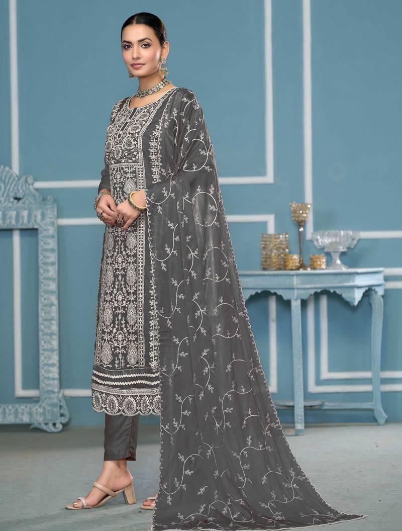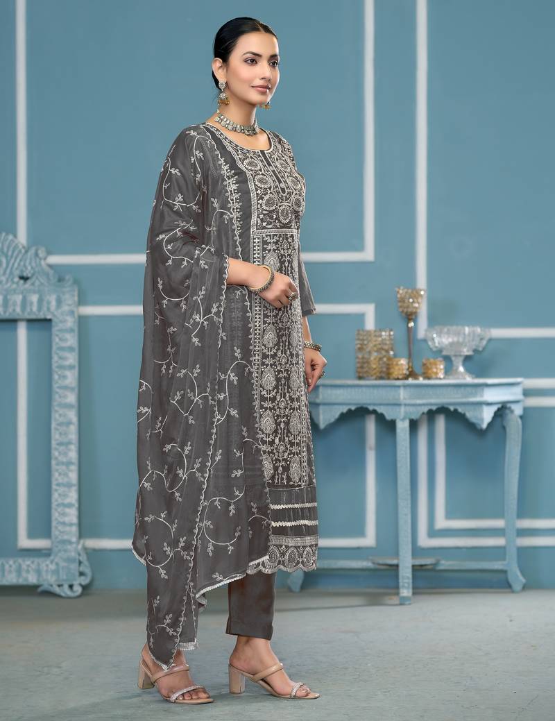 | Product Name | Dark Grey Embroidered Organza Semi Stitched Churidar Dress Materials | |
