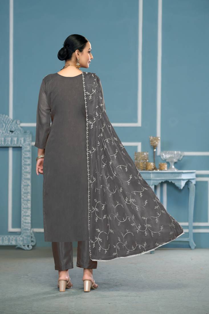 | Product Description | Wedding Perfect Designer Thread Embroidery With Daimond Work Along Fancy Border And With Stylish Embroidery Dupatta Work Straight Style 2.05 Mtr Unstitched Dress Material Top Of Dark Grey Colour Viscose Organja Fabric With 2 Mtr Heavy Santoon As Lining Inner Fabric Also Including 3.80 Mtr Unstiched Bottom Material Of Grey Colour Heavy Santoon Fabric With 2.05 Mtr Dupatta Of Grey Colour Nasmeen Fabric By Shadow & Saining Brand |