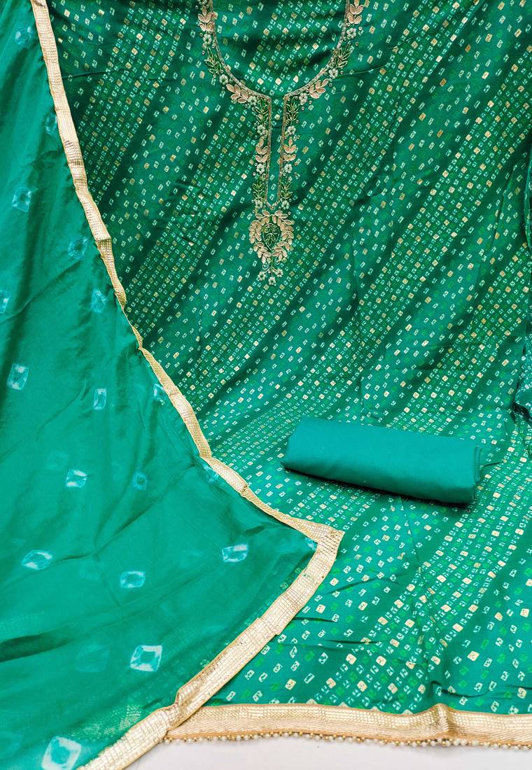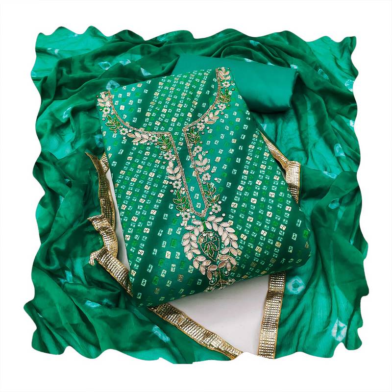 | Product Description | Opulent Designer Bandhani Print Handwork And Fancy Border With Stylish Saburi Printed Dupatta Straight Style 2.00 Mtr Unstitched Dress Material Top Of Green Colour Jam Cotton Fabric Also Including 2.40 Mtr Chudidar Style Bottom Piece Material Of Green Colour Cotton Fabric With 2.10 Mtr Dupatta Of Green Colour Nazneen Fabric By Shadow & Saining Brand |
