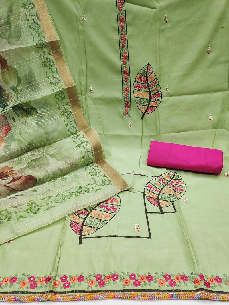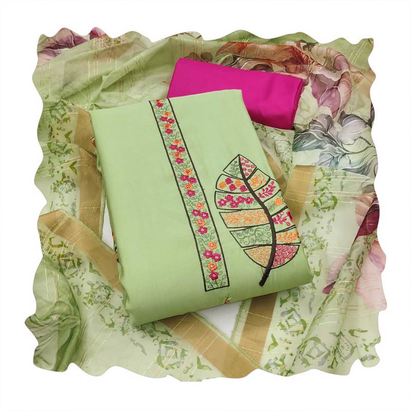 | Product Description | Easy Care Heavy Multi Thread Sequence Embroidery And Fancy Border With Designer Digital Printed Dupatta Straight Style 2.20 Mtr Unstitched Dress Material Top Of Green Colour Pure Cotton Silk Fabric Also Including 2.40 Mtr Chudidar Style Bottom Piece Material Of Pink Colour Rayon Fabric With 2.10 Mtr Dupatta Of Green Colour Soft Banarasi Fabric By Shadow & Saining Brand |