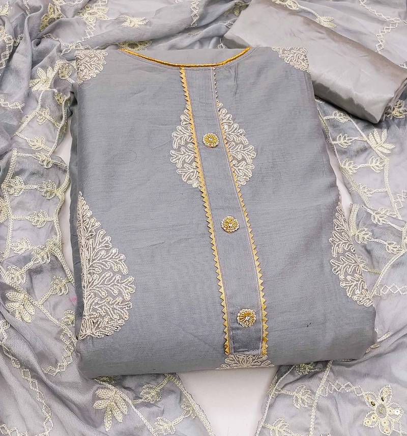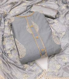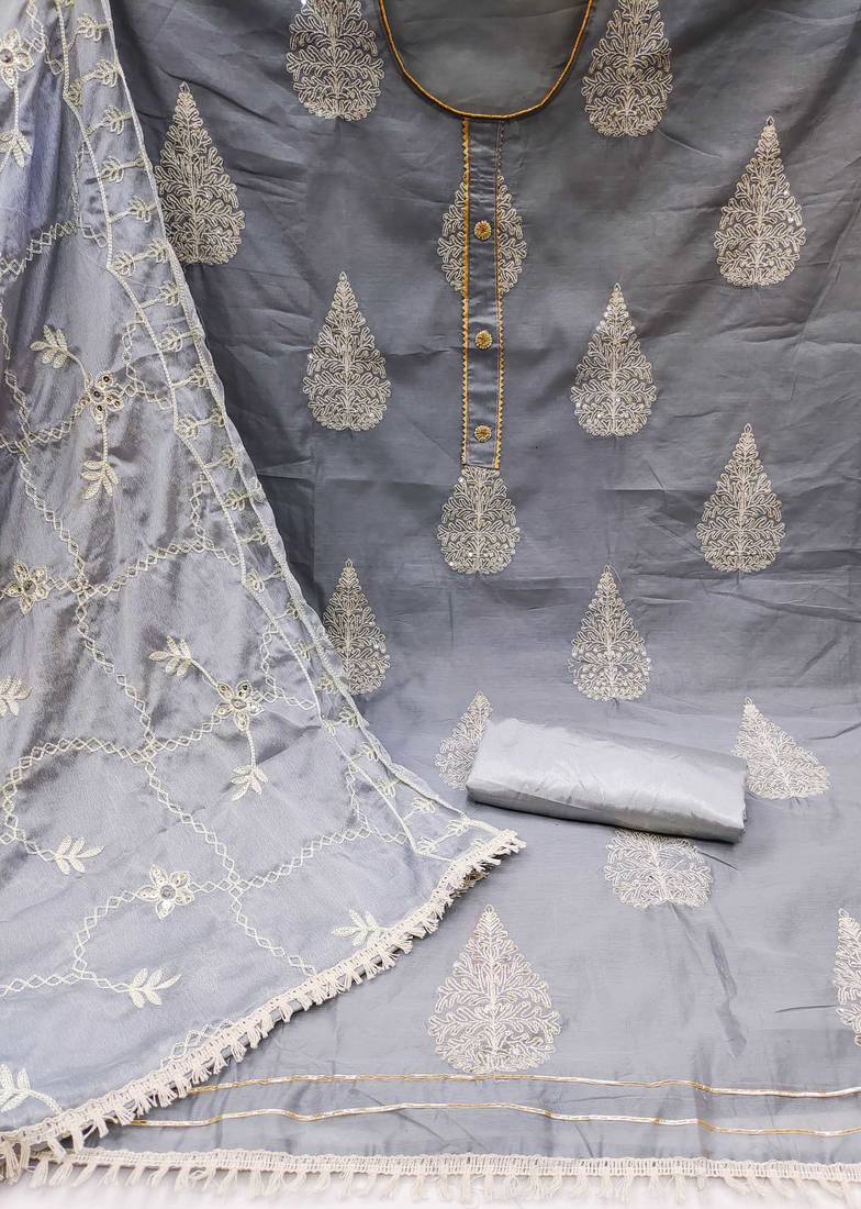 Grey chanderi embroidered dress material unstitched