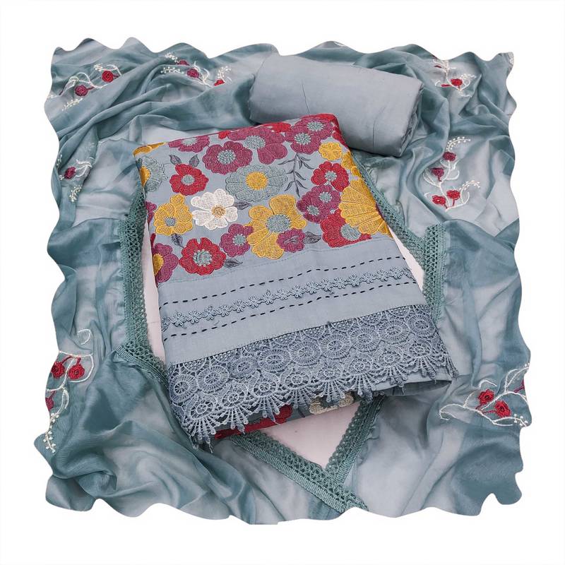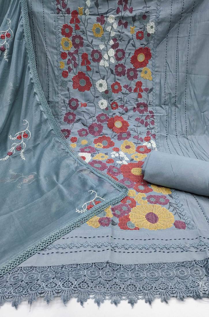 | Product Description | Bestseller Heavy Thread Embroidery And Fancy Border With Designer Embroidered Dupatta Straight Style 2.20 Mtr Unstitched Dress Material Top Of Grey Colour Premium Roman Cotton Fabric Also Including 2.40 Mtr Chudidar Style Bottom Piece Material Of Grey Colour Rayon Fabric With 2.10 Mtr Dupatta Of Grey Colour Nazneen Fabric By Shadow & Saining Brand |