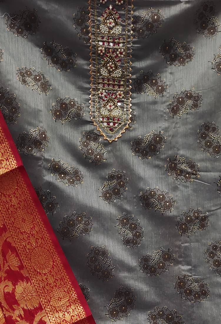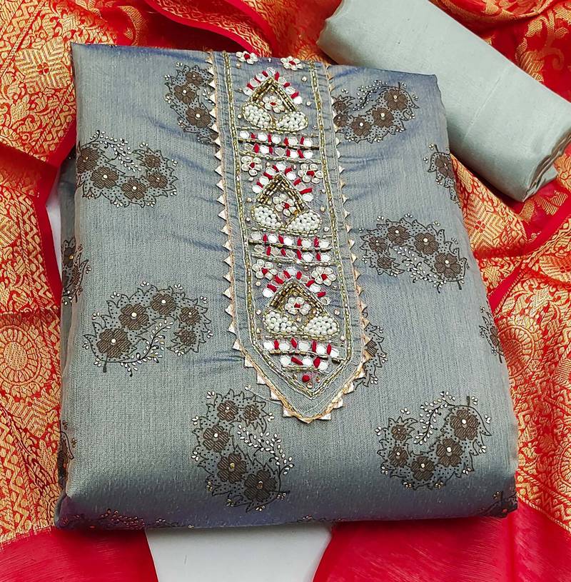 | Product Description | Dashing Heavy Handwork And Fancy Border With Weaving Dupatta Straight Style 1.80 Mtr Unstitched Dress Material Top Of Grey Colour Modal Chanderi Cotton Fabric Suggestable Quarter Style Sleeves And Round Style Neck Also Including 2.00 Mtr Chudidar Style Bottom Material Of Grey Colour Santoon Fabric With 2.00 Mtr Dupatta Of Red Colour Banarasi Jacquard Fabric |