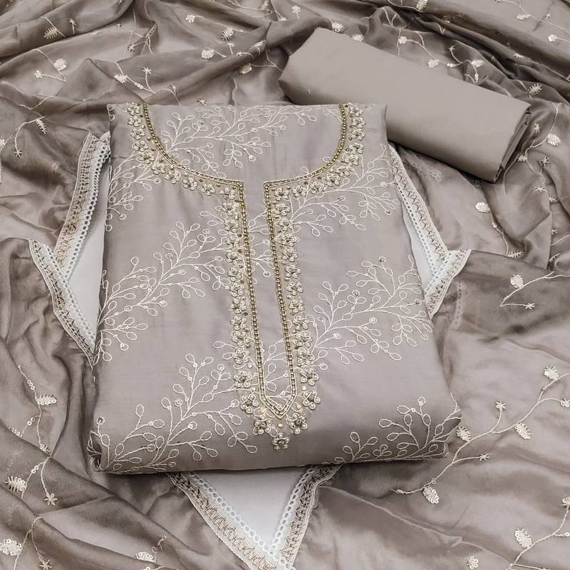 | Product Description | Dashing Heavy Thread Sequin Work Hand Work And Fancy Border With Embroidered Dupatta Straight Style 2.00 Mtr Unstitched Dress Material Top Of Grey Colour P V Cotton Fabric Also Including 2.40 Mtr Chudidar Style Bottom Piece Material Of Grey Colour Cotton Fabric With 2.00 Mtr Dupatta Of Grey Colour Nazneen Fabric |