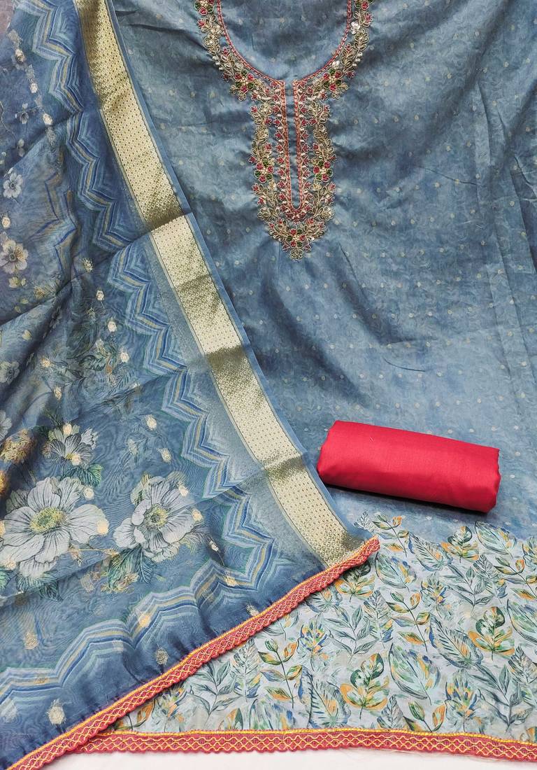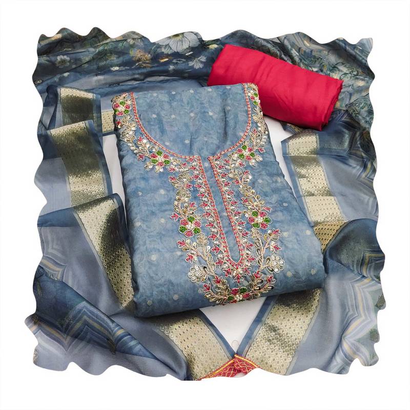| Product Description | Curated Designer Weaving Handwork And Fancy Border With Stylish Woven Printed Dupatta Straight Style 2.00 Mtr Unstitched Dress Material Top Of Grey Colour Banarasi Cotton Fabric Also Including 2.40 Mtr Chudidar Style Bottom Piece Material Of Maroon Colour Rayon Fabric With 2.10 Mtr Dupatta Of Grey Colour Soft Organja Fabric By Shadow & Saining Brand |