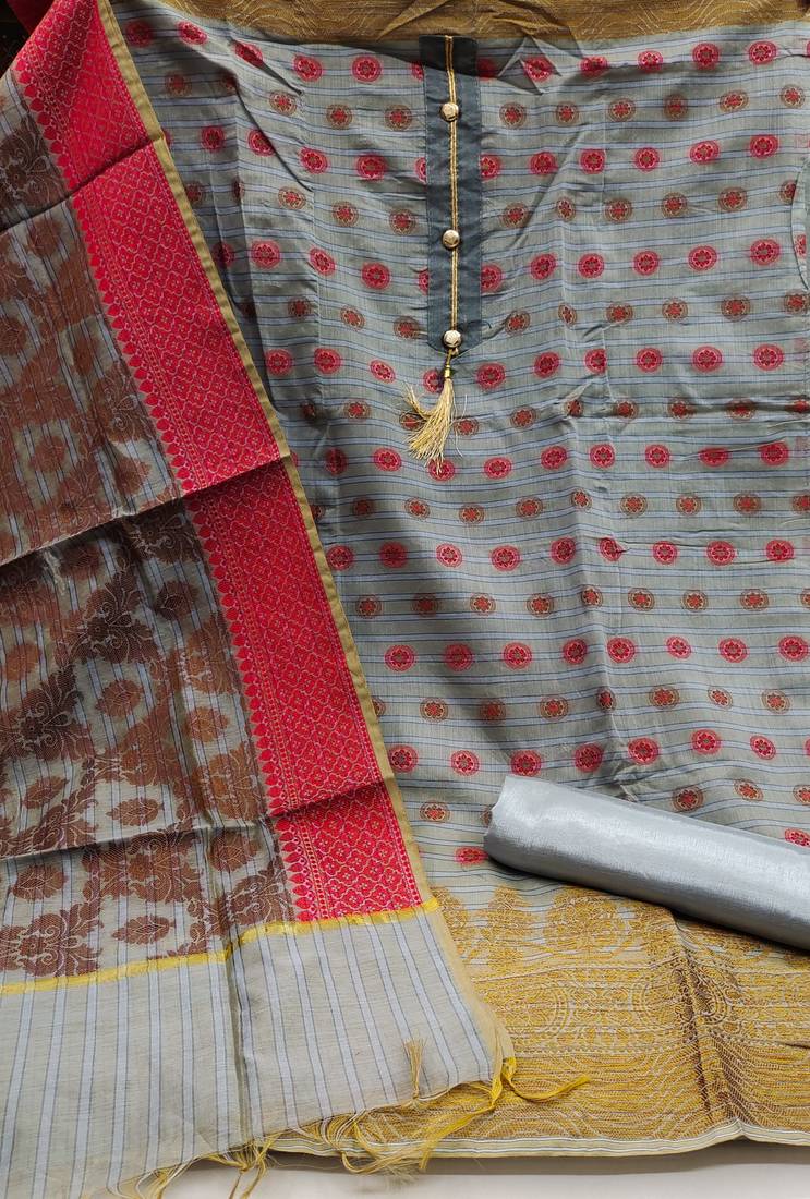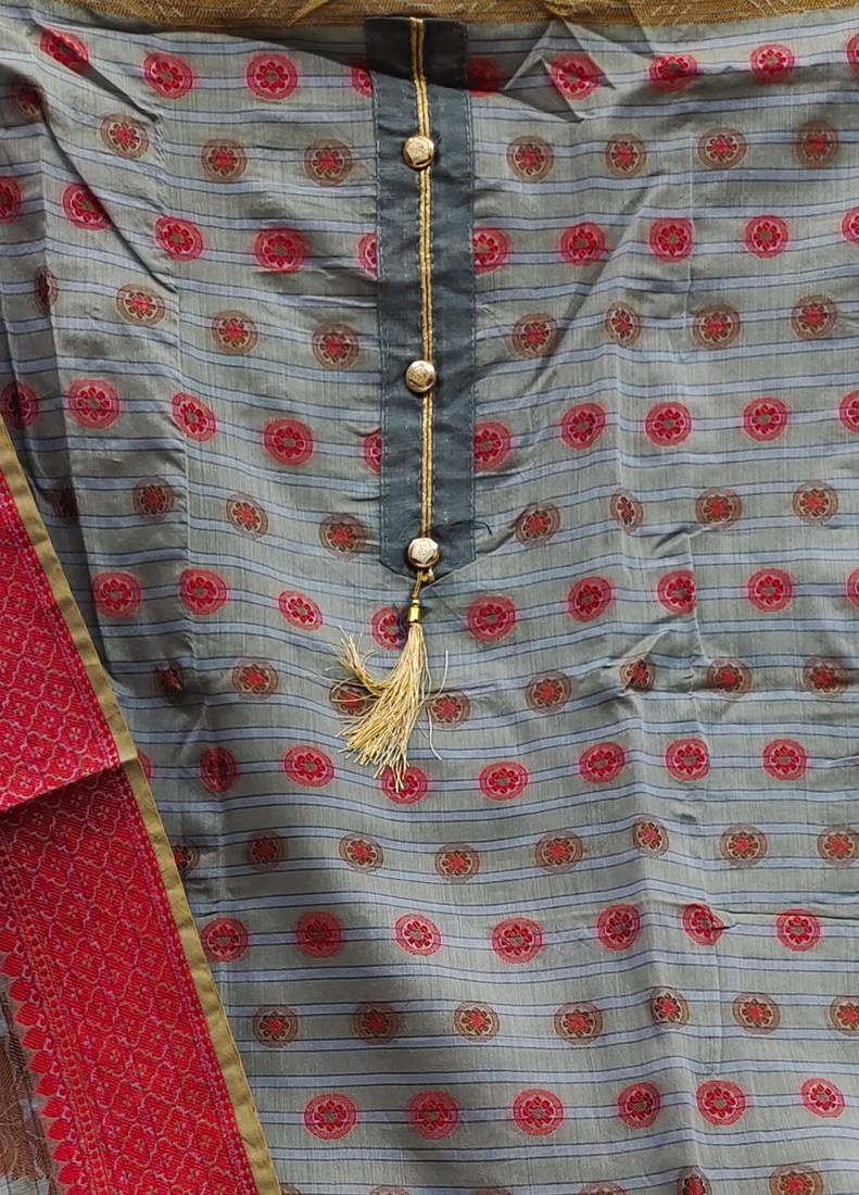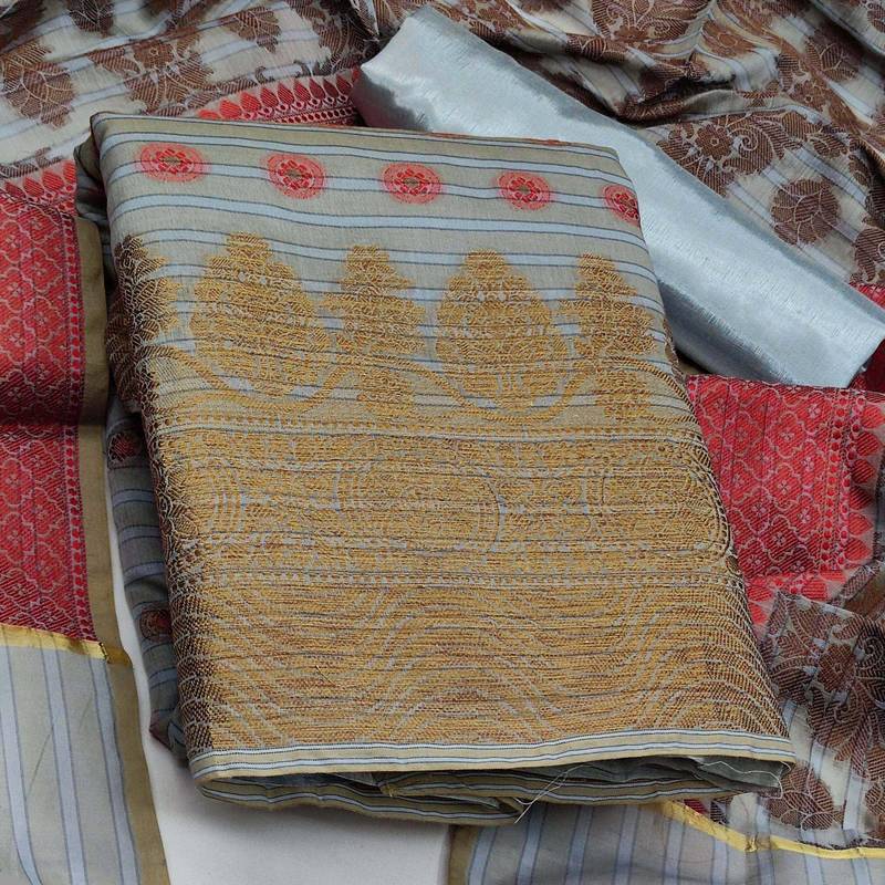 Weaving With Fancy Dupatta Straight Style 1.80 Mtr Unstitched Dress Material Top Of Grey Colour Banarasi Jacquard Fabric Suggestable Quarter Style Sleeves And Round Style Neck Also Including 2.00 Mtr Chudidar Style Bottom Material Of Grey Colour Santoon Fabric With 2.00 Mtr Dupatta Of Grey Colour Banarasi Fabric