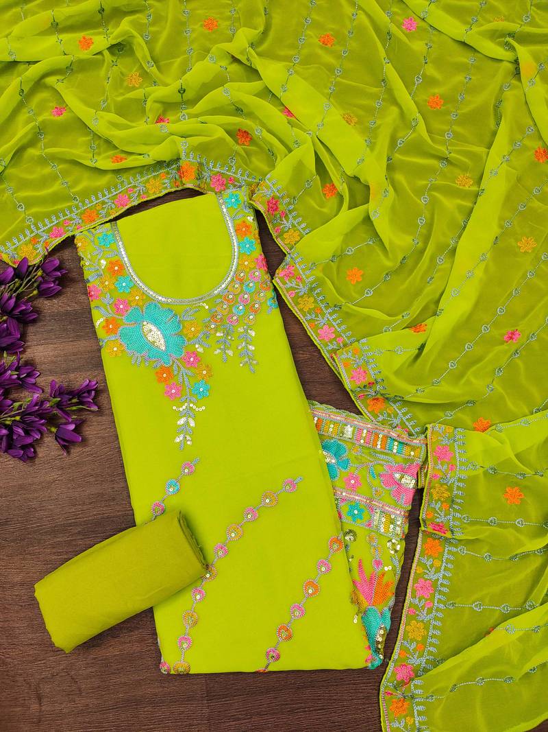 Fancy Heavy Chain Stitched Embroidery And Sequin Work With Embroidered Dupatta Straight Style 2.00 Mtr Unstitched Dress Material Top Of Light Green Colour Georgette Fabric With 2 Mtr Micro As Lining Inner Fabric Also Including 3.60 Mtr Unstitched Bottom Material Of Light Green Colour Micro Fabric With 2.00 Mtr Dupatta Of Light Green Colour Georgette Fabric