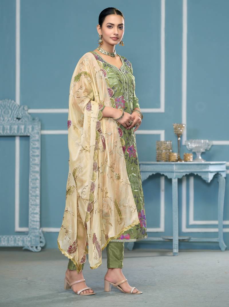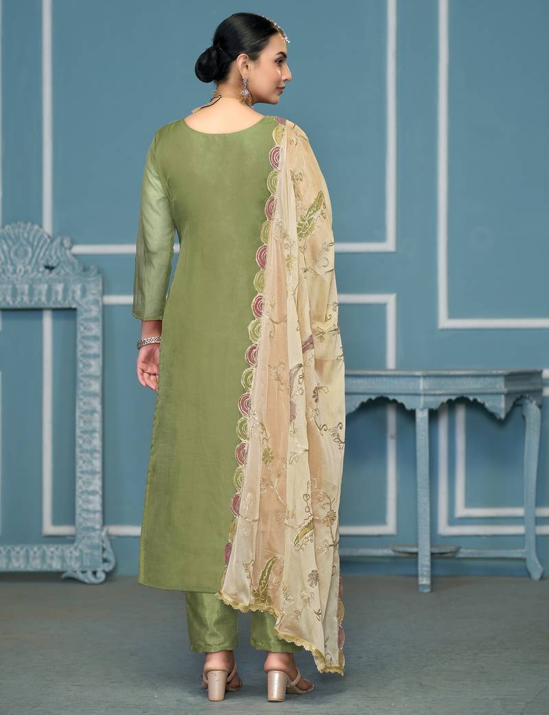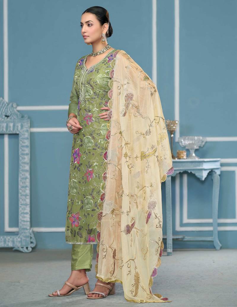 | Product Description | Heritage Heavy Thread Sequence Embroidered And Fancy Border With Designer Burs Embroidered Dupatta Straight Style 2.00 Mtr Unstitched Dress Material Top Of Light Green Colour Viscose Organja Fabric With 2 Mtr Dull Santoon As Lining Inner Fabric Also Including 3.80 Mtr Unstiched Bottom Material Of Light Green Colour Dull Santoon Fabric With 2.10 Mtr Dupatta Of Multi Colour Nazneen Fabric By Shadow & Saining Brand |
