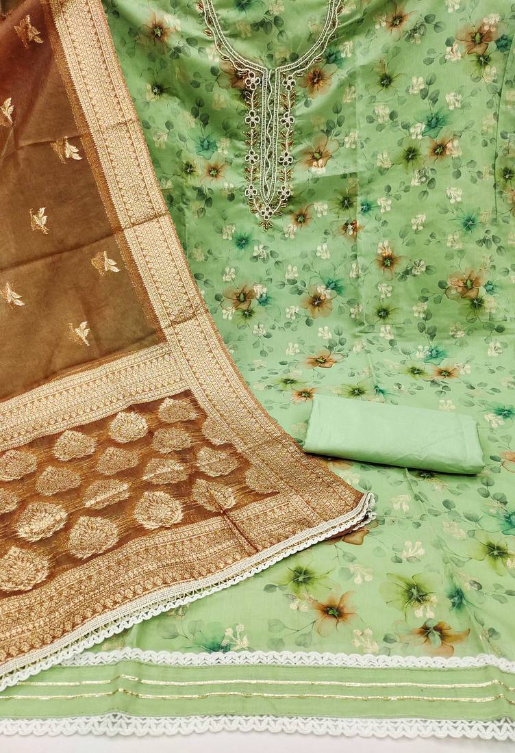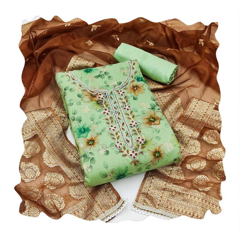 | Product Description | Colorfast Designer Weaving Digital Print Handwork And Fancy Border With Stylish Printed Woven Dupatta Straight Style 2.00 Mtr Unstitched Dress Material Top Of Light Green Colour Modal Banarasi Jacquard Fabric With 2 Mtr Dull Santoon As Lining Inner Fabric Also Including 3.80 Mtr Unstiched Bottom Material Of Light Green Colour Dull Santoon Fabric With 2.10 Mtr Dupatta Of Brown Colour Organja Banarasi Fabric By Shadow & Saining Brand |