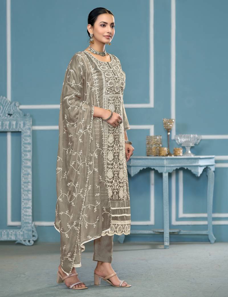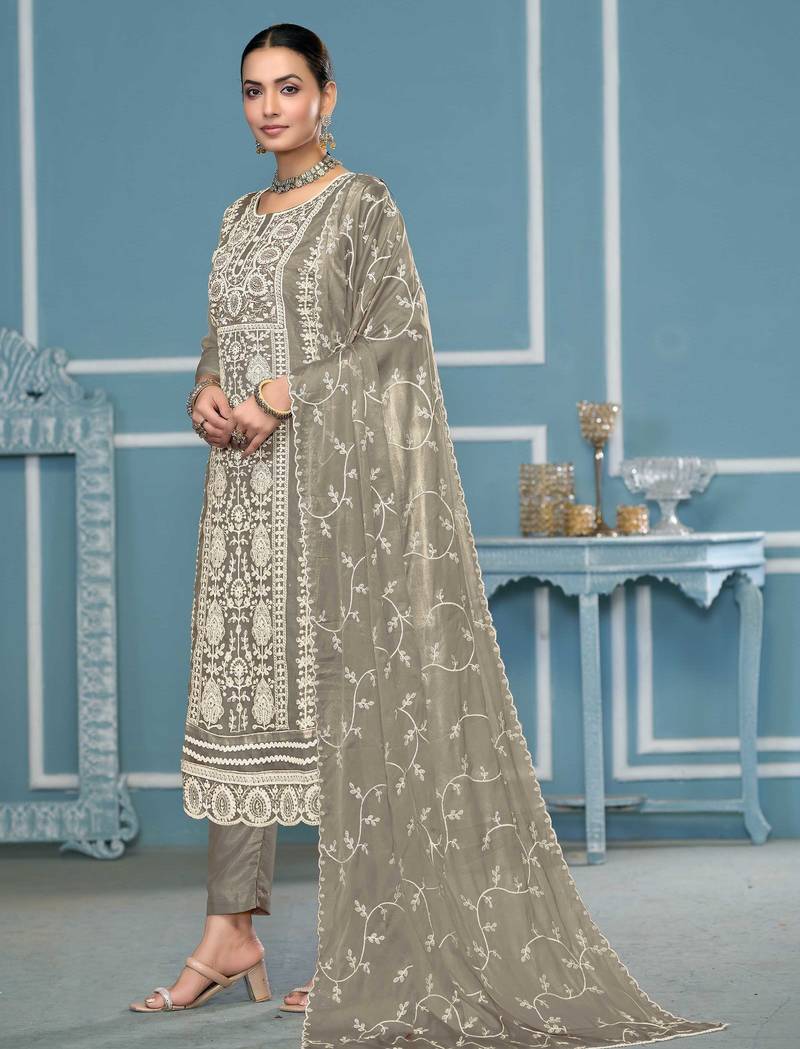 Light-grey embroidered organza semi stitched churidar dress-materials
