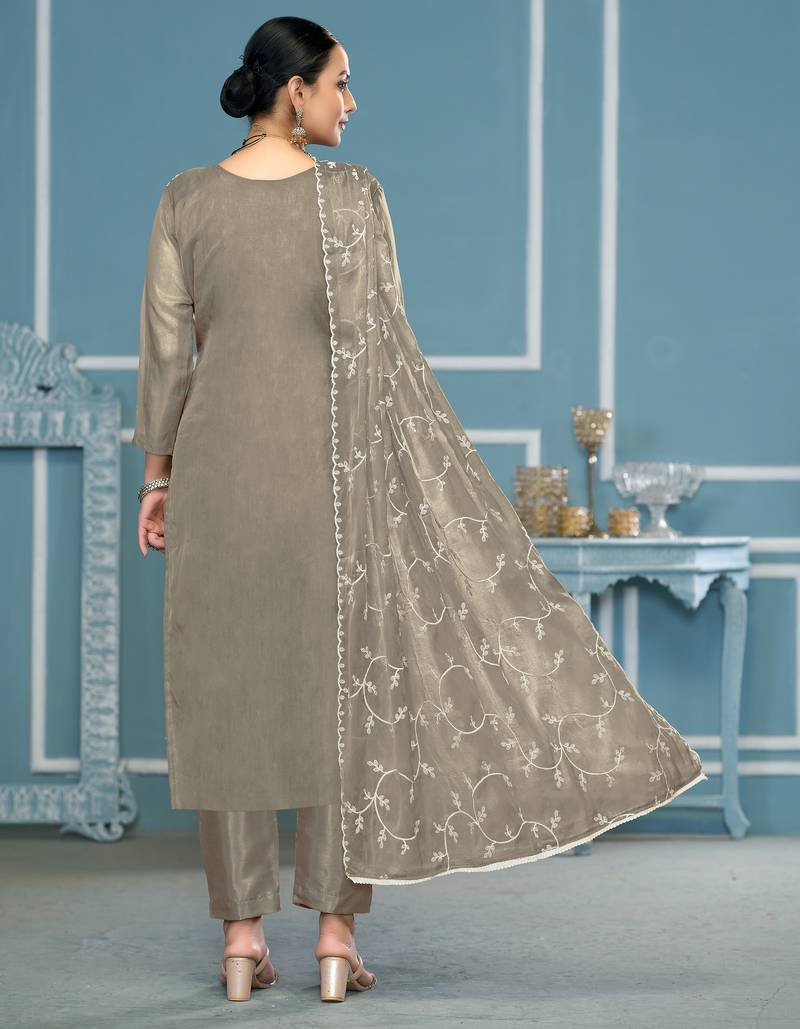 | Product Description | Versatile Designer Thread Embroidery With Daimond Work Along Fancy Border And With Stylish Embroidery Dupatta Work Straight Style 2.05 Mtr Unstitched Dress Material Top Of Light Grey Colour Viscose Organja Fabric With 2 Mtr Heavy Santoon As Lining Inner Fabric Also Including 3.80 Mtr Unstiched Bottom Material Of Grey Colour Heavy Santoon Fabric With 2.05 Mtr Dupatta Of Grey Colour Nasmeen Fabric By Shadow & Saining Brand |