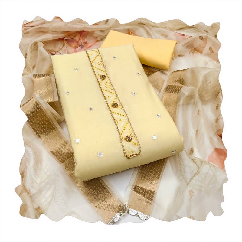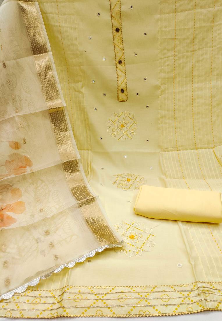 | Product Description | Luxury Fancy Thread Mirror Patch Embroidery And Heavy Border With Designer Digital Printed Woven Dupatta Straight Style 2.20 Mtr Unstitched Dress Material Top Of Light Yellow Colour Pure Cotton Silk Fabric Also Including 2.40 Mtr Chudidar Style Bottom Piece Material Of Light Yellow Colour Dull Santoon Fabric With 2.10 Mtr Dupatta Of Light Yellow Colour Soft Banarasi Fabric By Shadow & Saining Brand |