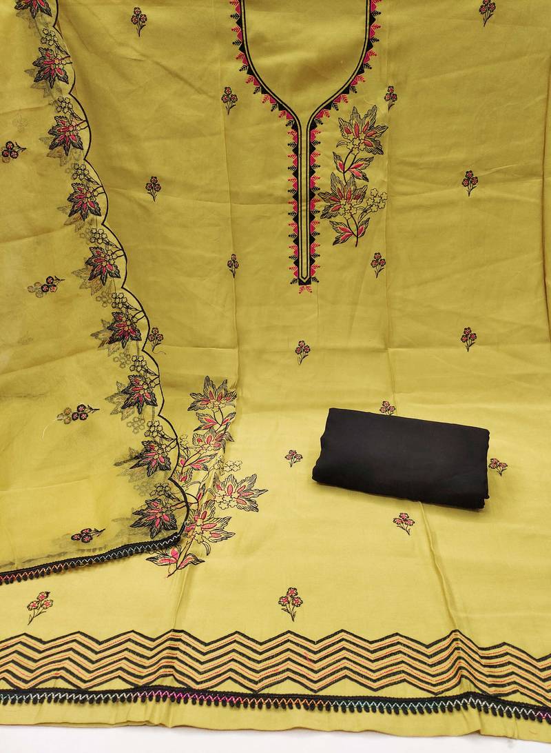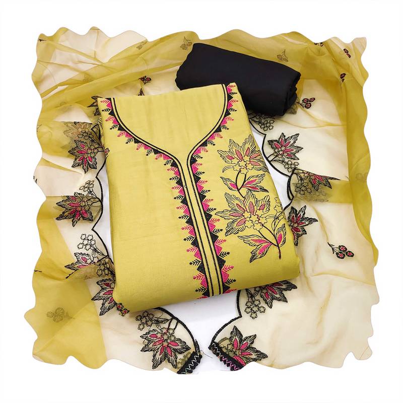 Chic Heavy Thread Embroidery And Fancy Border With Designer Embroidered Dupatta Straight Style 2.20 Mtr Unstitched Dress Material Top Of Light Yellow Colour Pure Cotton Silk Fabric Also Including 2.40 Mtr Chudidar Style Bottom Piece Material Of Black Colour Rayon Fabric With 2.10 Mtr Dupatta Of Light Yellow Colour Organja Fabric By Shadow & Saining Brand