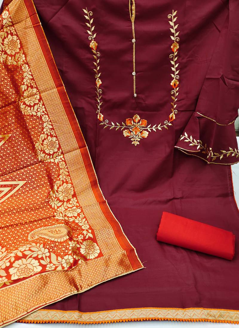 Maroon cotton embroidered dress material unstitched