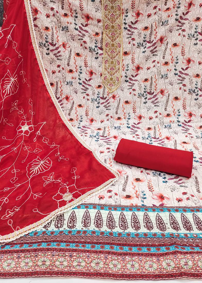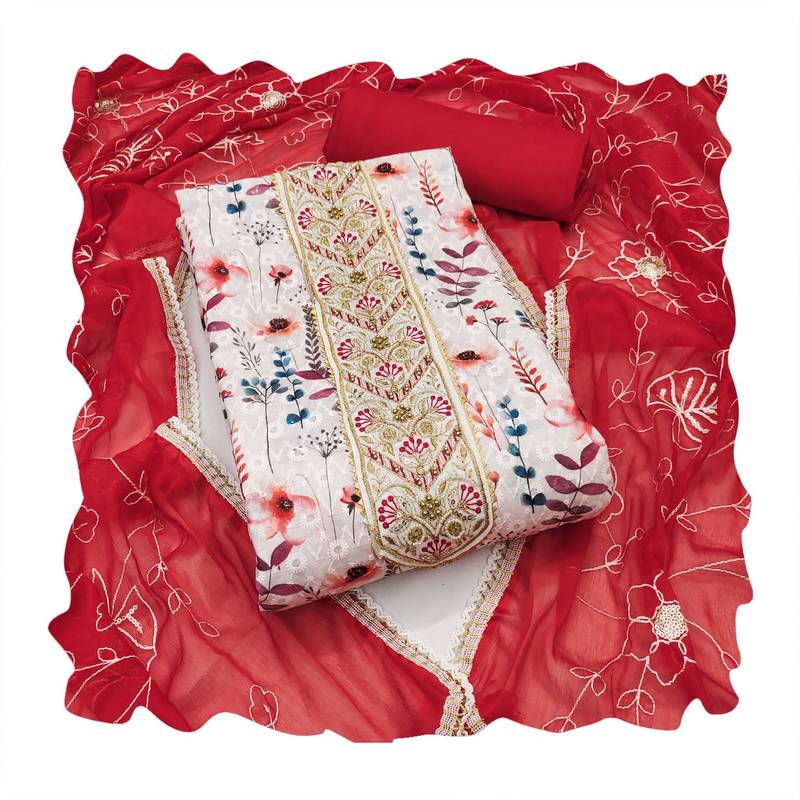 | Product Description | Chic Heavy Thread Embroidery Digital Print Handwork And Fancy Border With Designer Embroidered Dupatta Straight Style 2.00 Mtr Unstitched Dress Material Top Of Multi Colour Pure Cambric Cotton Fabric Also Including 2.40 Mtr Chudidar Style Bottom Piece Material Of Maroon Colour Rayon Fabric With 2.10 Mtr Dupatta Of Maroon Colour Nazneen Fabric By Shadow & Saining Brand |