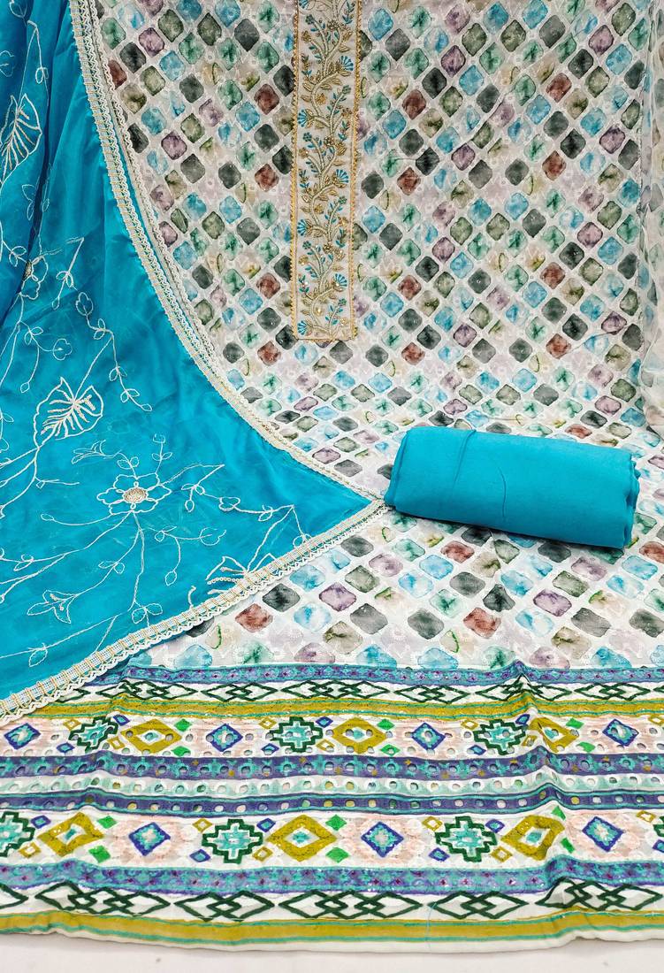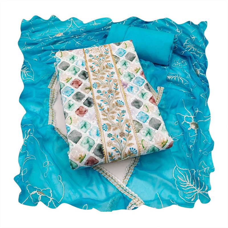 | Product Description | Wedding Perfect Heavy Thread Embroidery Digital Print Handwork And Fancy Border With Designer Embroidered Dupatta Straight Style 2.00 Mtr Unstitched Dress Material Top Of Multi Colour Pure Cambric Cotton Fabric Also Including 2.40 Mtr Chudidar Style Bottom Piece Material Of Sky Blue Colour Rayon Fabric With 2.10 Mtr Dupatta Of Sky Blue Colour Nazneen Fabric By Shadow & Saining Brand |
