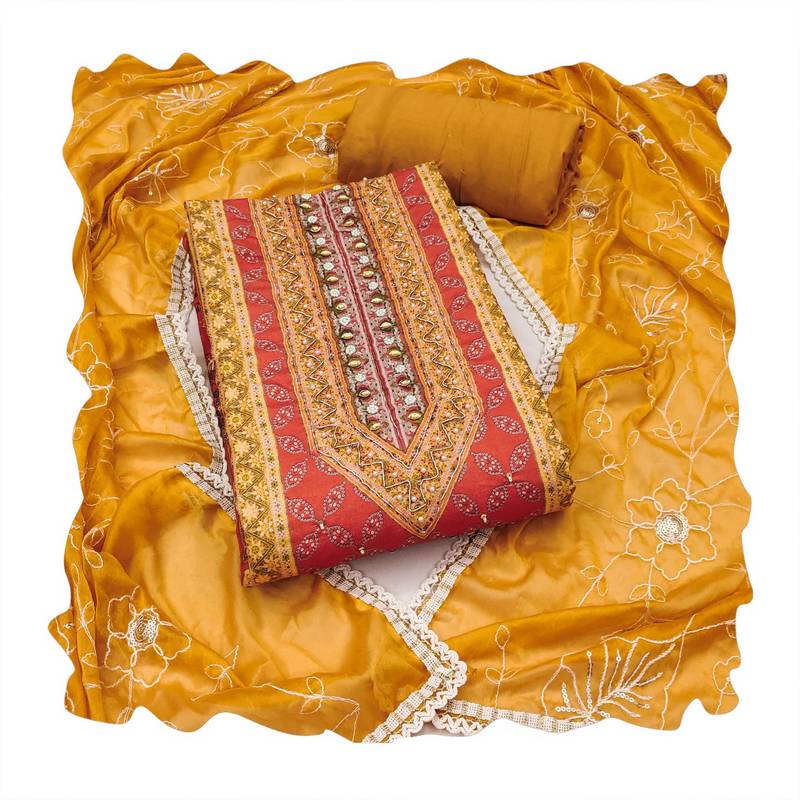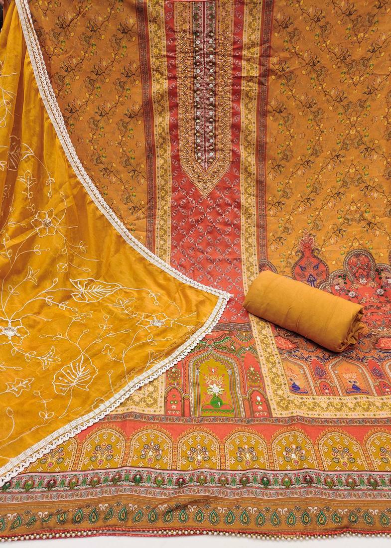 | Product Description | Luxury Designer Print Handwork Embroidery And Fancy Border With Heavy Embroidered Dupatta Straight Style 2.00 Mtr Unstitched Dress Material Top Of Multi Colour Jaam Cotton Fabric Also Including 2.40 Mtr Chudidar Style Bottom Piece Material Of Mustard Colour Rayon Fabric With 2.10 Mtr Dupatta Of Mustard Colour Nazneen Fabric By Shadow & Saining Brand |