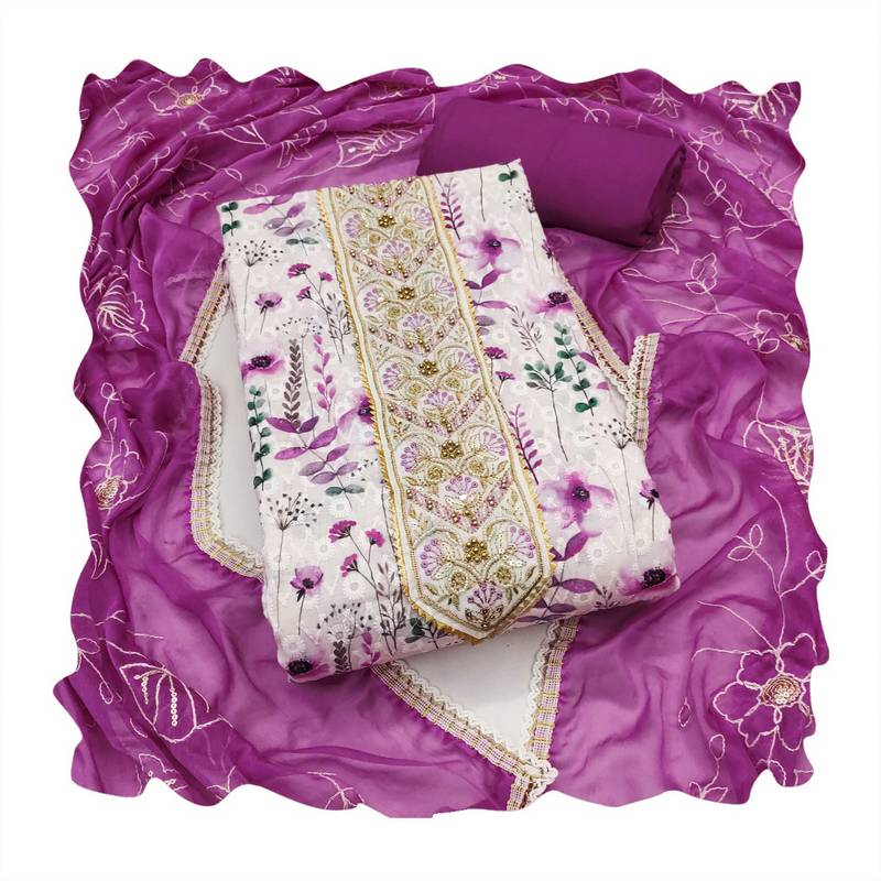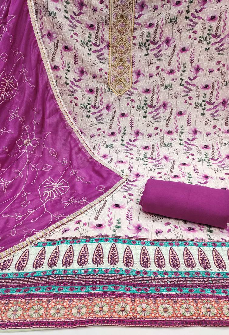 | Product Description | Ethereal Heavy Thread Embroidery Digital Print Handwork And Fancy Border With Designer Embroidered Dupatta Straight Style 2.00 Mtr Unstitched Dress Material Top Of Multi Colour Pure Cambric Cotton Fabric Also Including 2.40 Mtr Chudidar Style Bottom Piece Material Of Purple Colour Rayon Fabric With 2.10 Mtr Dupatta Of Purple Colour Nazneen Fabric By Shadow & Saining Brand |