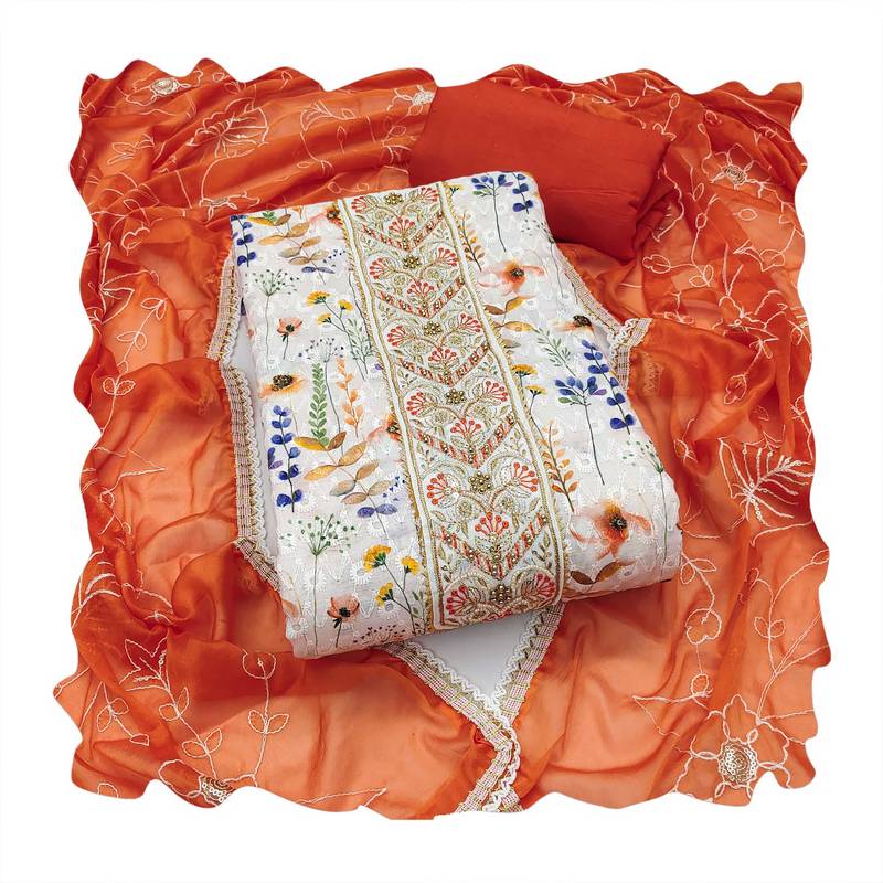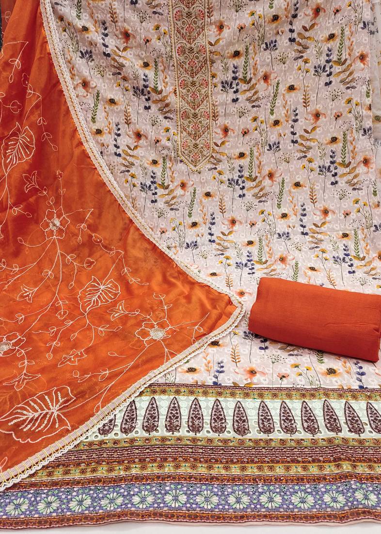 | Product Description | Sophisticated Heavy Thread Embroidery Digital Print Handwork And Fancy Border With Designer Embroidered Dupatta Straight Style 2.00 Mtr Unstitched Dress Material Top Of Multi Colour Pure Cambric Cotton Fabric Also Including 2.40 Mtr Chudidar Style Bottom Piece Material Of Rust Colour Rayon Fabric With 2.10 Mtr Dupatta Of Rust Colour Nazneen Fabric By Shadow & Saining Brand |