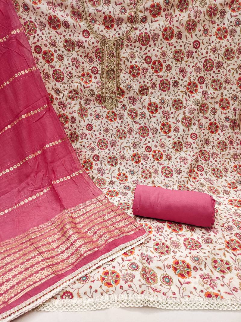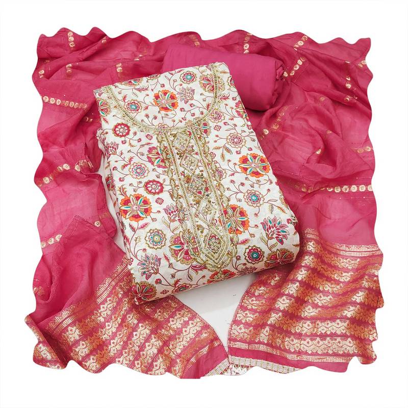 Timeless Designer Print Handwork Embroidery And Fancy Border With Stylish Woven Dupatta Straight Style 2.00 Mtr Unstitched Dress Material Top Of Multi Colour Roman Cotton Silk Fabric Also Including 2.40 Mtr Chudidar Style Bottom Piece Material Of Pink Colour Rayon Fabric With 2.00 Mtr Dupatta Of Pink Colour Chanderi Cotton Banarasi Fabric By Shadow & Saining Brand