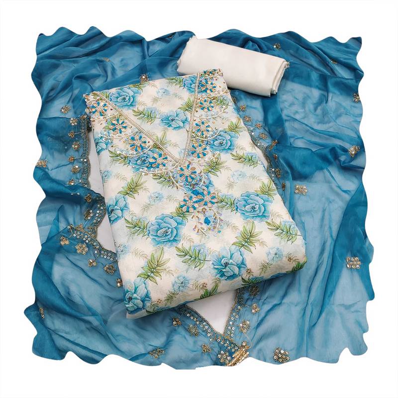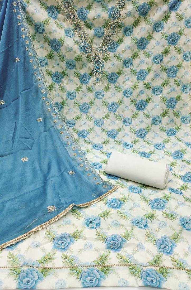 | Product Description | Luxury Designer Digital Print, Handwork And Fancy Border With Embroidered Dupatta Straight Style 2.00 Mtr Unstitched Dress Material Top Of Multi Colour Modal Cotton Butti Fabric With 2 Mtr Dull Santoon As Lining Inner Fabric Also Including 4.00 Mtr Unstiched Bottom Material Of White Colour Dull Santoon Fabric With 2.10 Mtr Dupatta Of Blue Colour Nazneen Fabric By Shadow & Saining Brand |