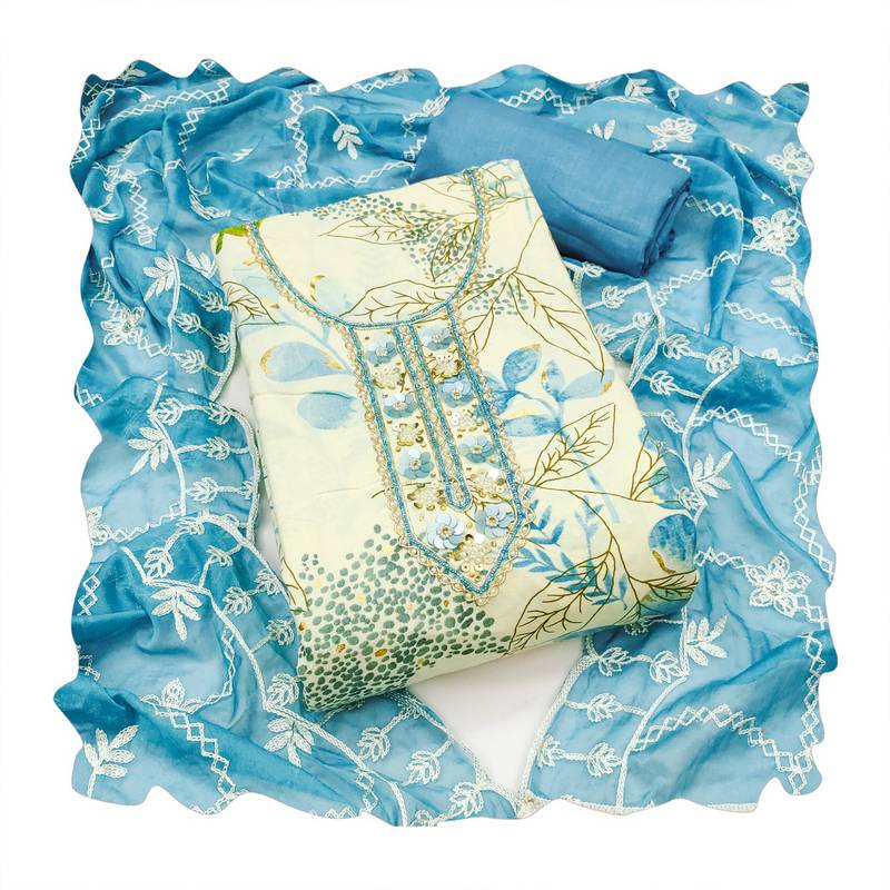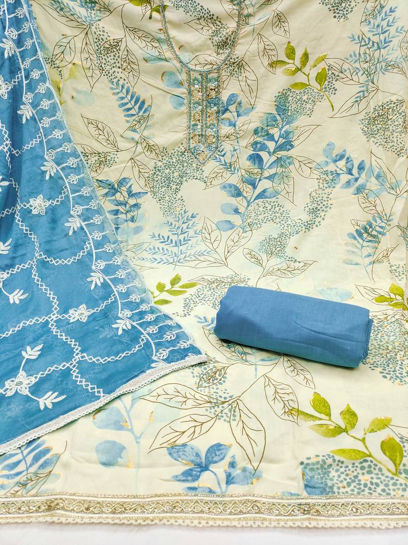 | Product Description | Editor’s Pick Designer Print Stylish Handwork And Fancy Border With Heavy Embroidered Dupatta Straight Style 2.00 Mtr Unstitched Dress Material Top Of Multi Colour Jaam Cotton Fabric Also Including 2.40 Mtr Chudidar Style Bottom Piece Material Of Blue Colour Dull Santoon Fabric With 2.10 Mtr Dupatta Of Blue Colour Nazneen Fabric By Shadow & Saining Brand |