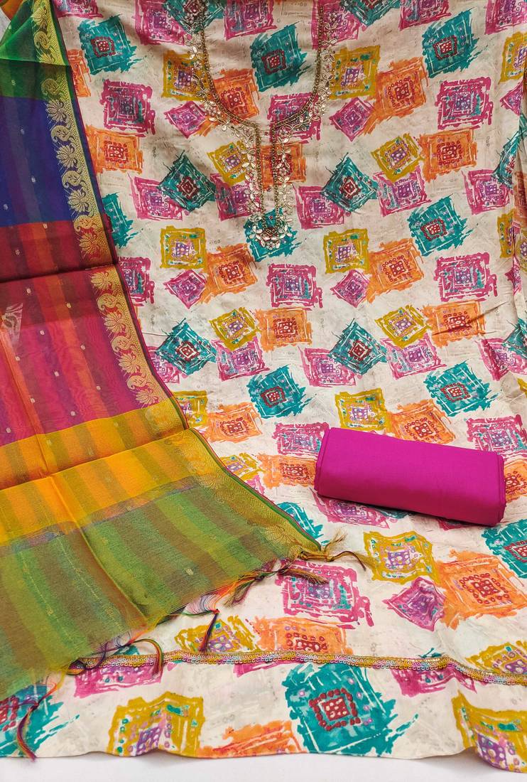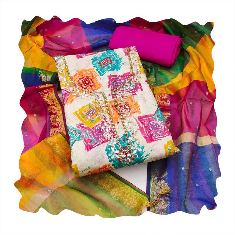 | Product Description | Trendsetting Designer Print Handwork And Fancy Border With Stylish Woven Dupatta Straight Style 2.00 Mtr Unstitched Dress Material Top Of Multi Colour Modal Cotton Fabric Also Including 2.40 Mtr Chudidar Style Bottom Piece Material Of Pink Colour Rayon Fabric With 2.10 Mtr Dupatta Of Multi Colour Soft Chanderi Banarasi Fabric By Shadow & Saining Brand |