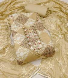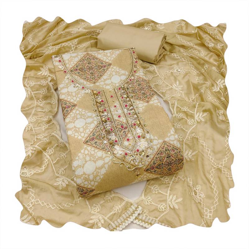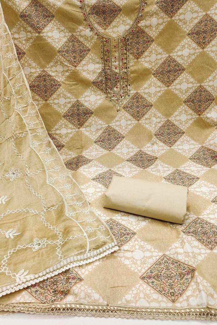| Product Description | Party Perfect Designer Print Stylish Handwork And Fancy Border With Heavy Embroidered Dupatta Straight Style 2.00 Mtr Unstitched Dress Material Top Of Multi Colour Cembric Cotton Fabric Also Including 2.40 Mtr Chudidar Style Bottom Piece Material Of Beige Colour Dull Santoon Fabric With 2.10 Mtr Dupatta Of Beige Colour Nazneen Fabric By Shadow & Saining Brand |