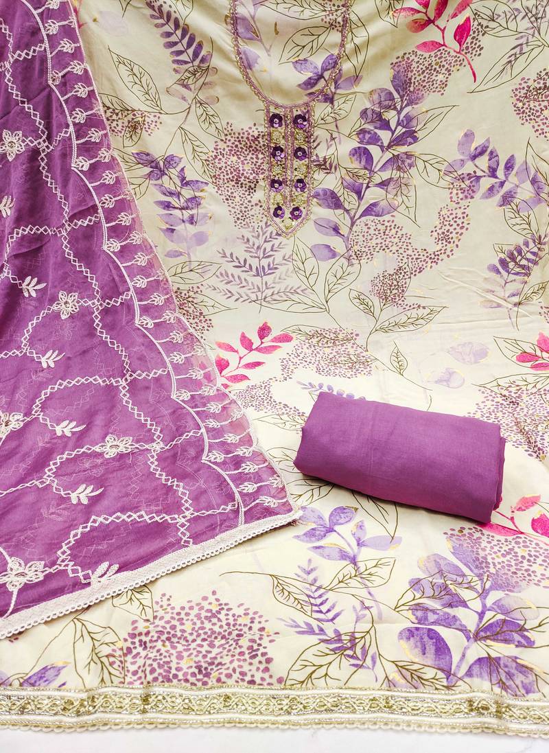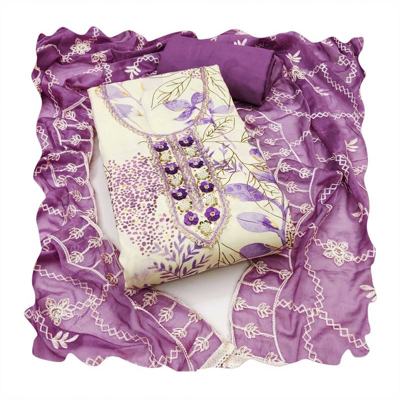 | Product Description | Bestseller Designer Print Stylish Handwork And Fancy Border With Heavy Embroidered Dupatta Straight Style 2.00 Mtr Unstitched Dress Material Top Of Multi Colour Jaam Cotton Fabric Also Including 2.40 Mtr Chudidar Style Bottom Piece Material Of Purple Colour Dull Santoon Fabric With 2.10 Mtr Dupatta Of Purple Colour Nazneen Fabric By Shadow & Saining Brand |