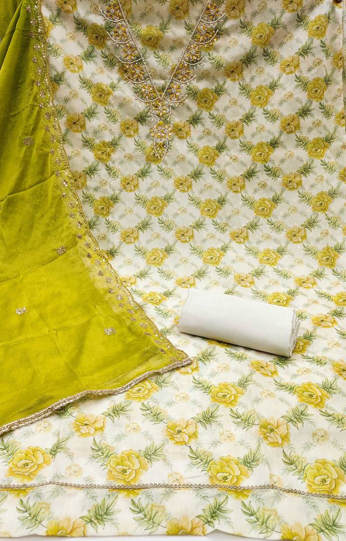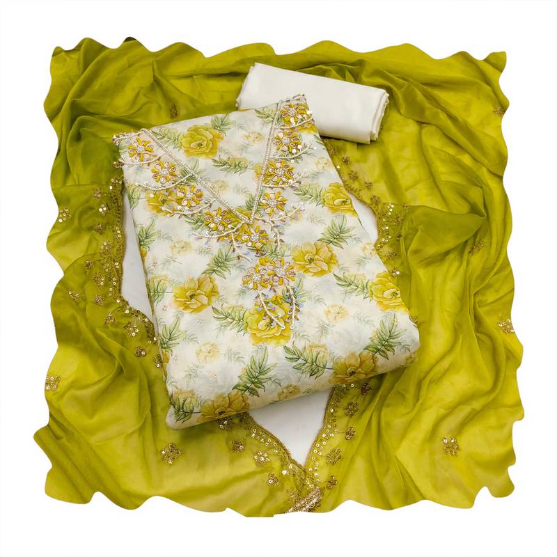 | Product Description | Statement Designer Digital Print, Handwork And Fancy Border With Embroidered Dupatta Straight Style 2.00 Mtr Unstitched Dress Material Top Of Multi Colour Modal Cotton Butti Fabric With 2 Mtr Dull Santoon As Lining Inner Fabric Also Including 4.00 Mtr Unstiched Bottom Material Of White Colour Dull Santoon Fabric With 2.10 Mtr Dupatta Of Green Colour Nazneen Fabric By Shadow & Saining Brand |