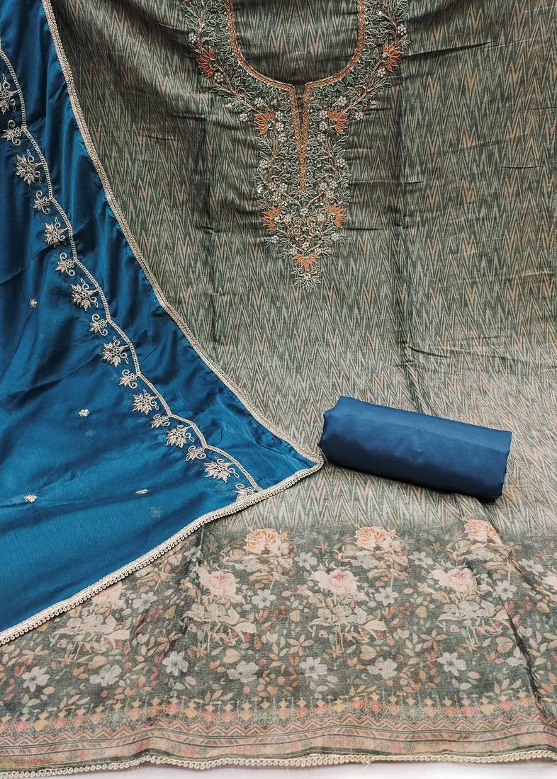 | Product Description | Soft Touch Designer Print Heavy Handwork And Fancy Border With Stylish Embroidered Dupatta Straight Style 2.00 Mtr Unstitched Dress Material Top Of Multi Colour Cotton Silk Fabric Also Including 2.40 Mtr Chudidar Style Bottom Piece Material Of Teal Blue Colour Dull Santoon Fabric With 2.10 Mtr Dupatta Of Teal Blue Colour Nazneen Fabric By Shadow & Saining Brand |