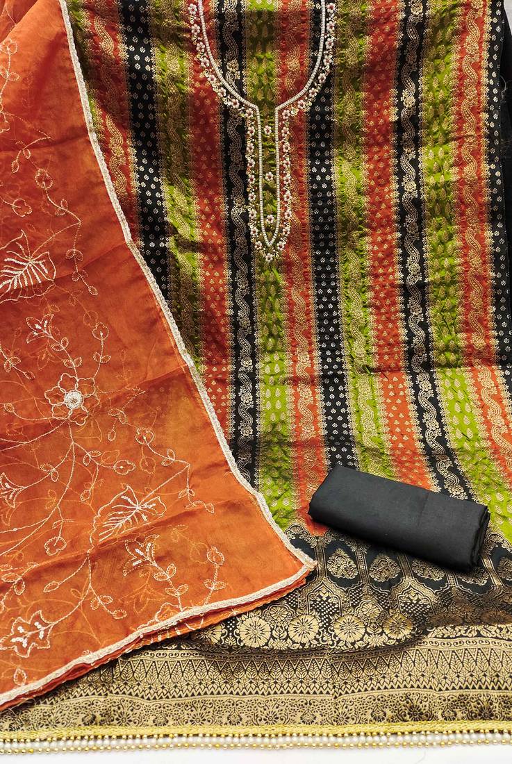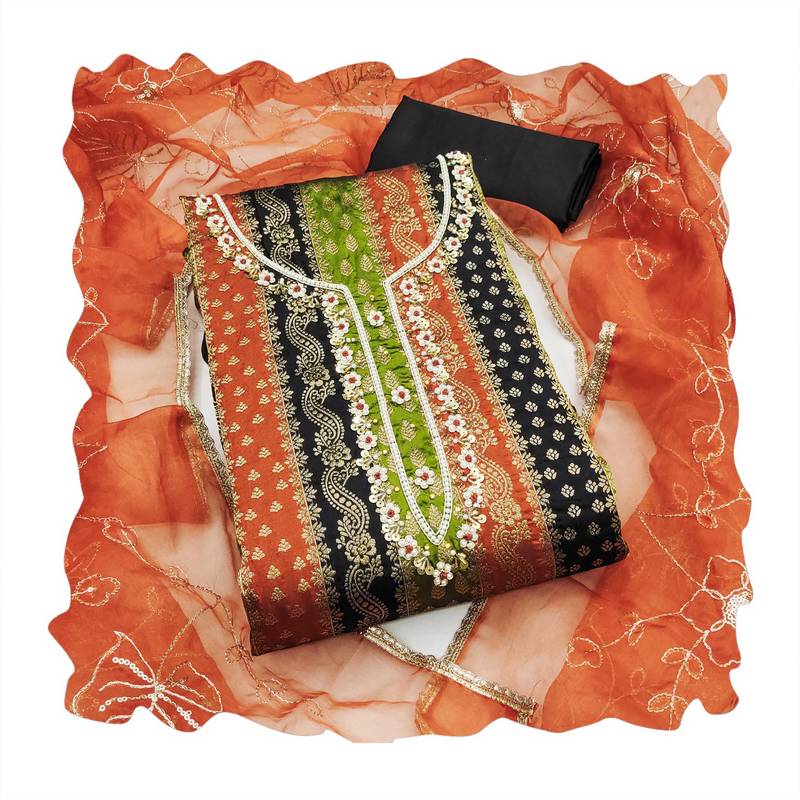| Product Description | Editor’s Pick With Handwork+ Fancy Work Dupatta Straight Style 2.00 Mtr Unstitched Dress Material Top Of Multi Colour Banarasi Jacquard Fabric With 2 Mtr Dull Santoon As Lining Inner Fabric Also Including 3.80 Mtr Unstiched Bottom Material Of Black Colour Dull Santoon Fabric With 2.10 Mtr Dupatta Of Orange Colour Organja Fabric By Shadow & Saining Brand |