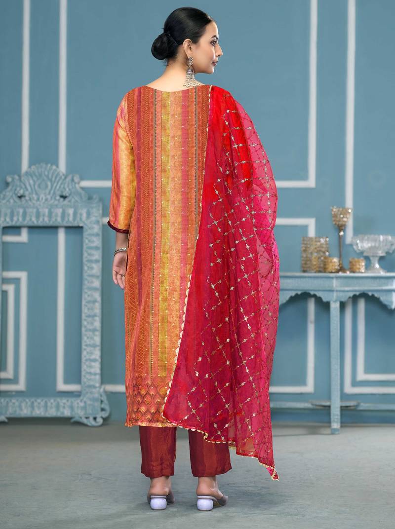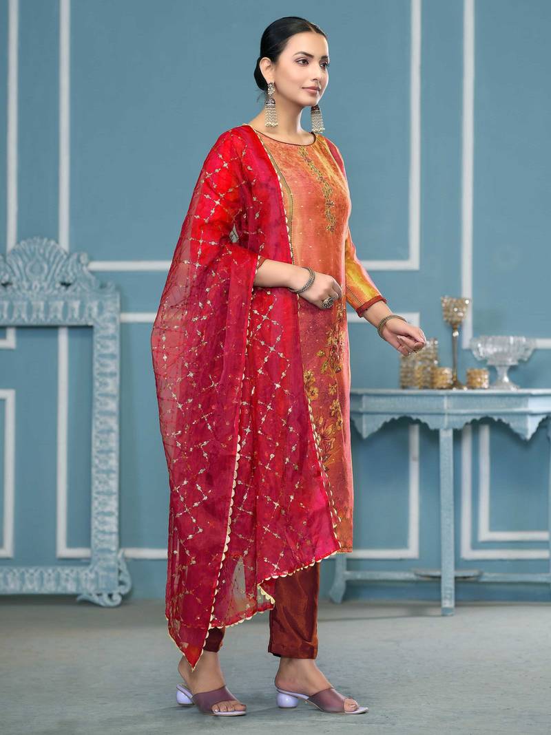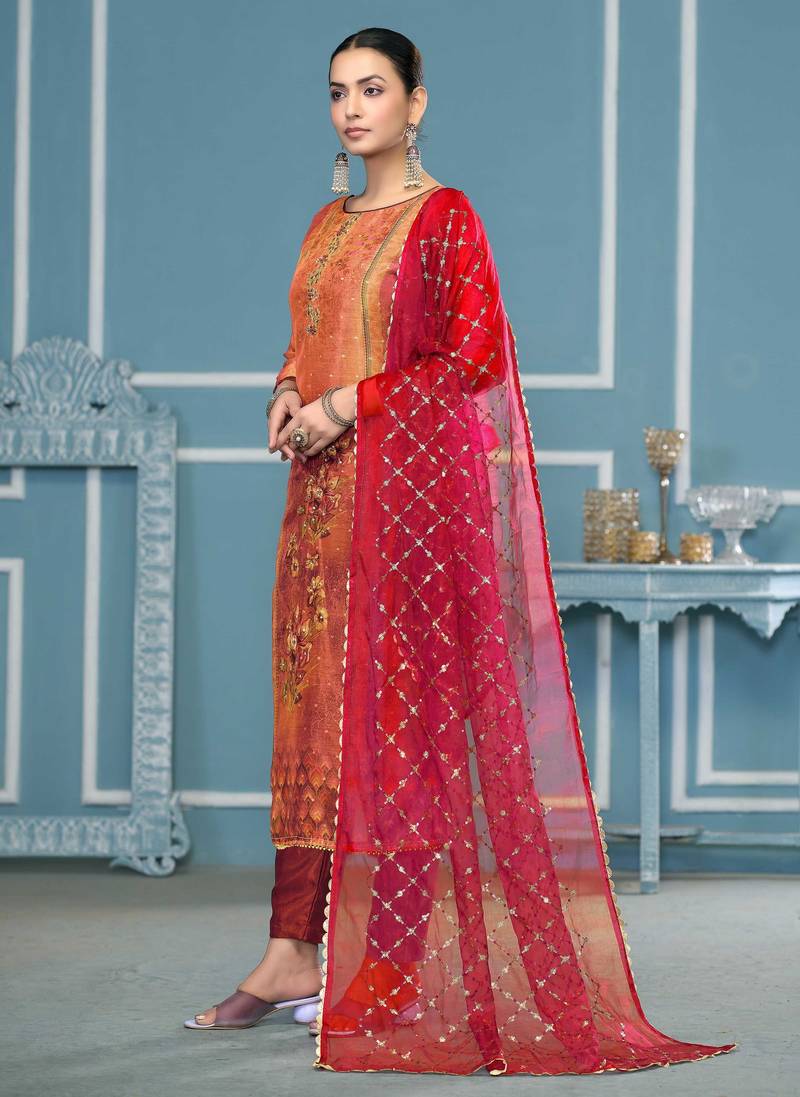 | Product Description | Luxury Designer Print, Hand Work And Fancy Border With Embroidered Dupatta Straight Style 2.10 Mtr Unstitched Dress Material Top Of Multi Colour Simmer Fabric With 2 Mtr Dull Santoon As Lining Inner Fabric Also Including 3.80 Mtr Unstiched Bottom Material Of Red Colour Dull Santoon Fabric With 2.10 Mtr Dupatta Of Red Colour Organza Fabric By Shadow & Saining Brand |