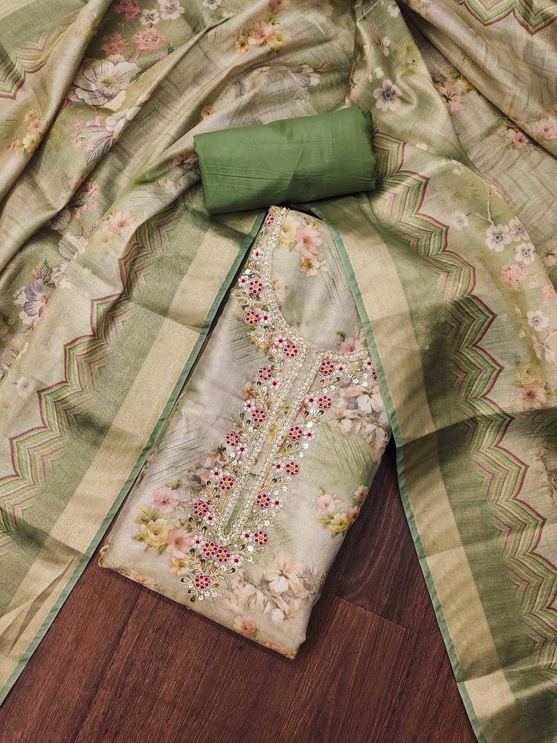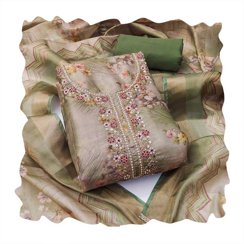 | Product Description | Exclusive Designer Digital Print Handwork And Fancy Border With Heavy Printed Dupatta Straight Style 2.00 Mtr Unstitched Dress Material Top Of Multi Colour Viscose Fabric Also Including 2.40 Mtr Chudidar Style Bottom Piece Material Of Light Green Colour Dull Santoon Fabric With 2.10 Mtr Dupatta Of Multi Colour Soft Banarasi Fabric By Shadow & Saining Brand |