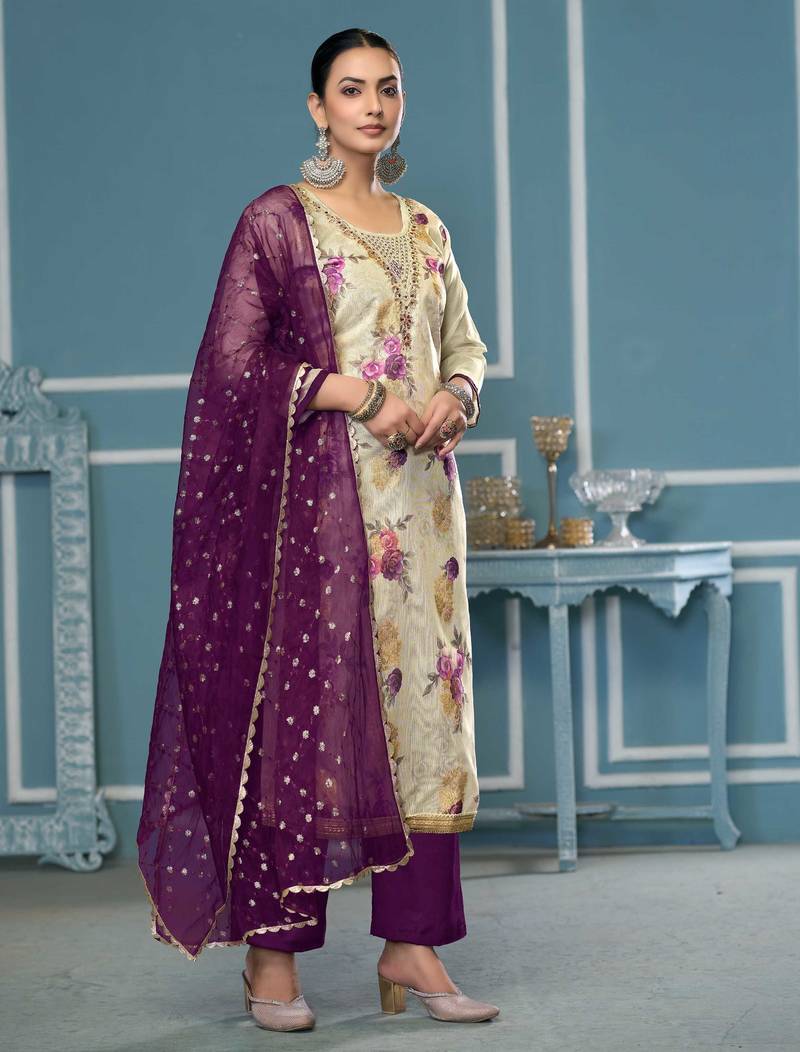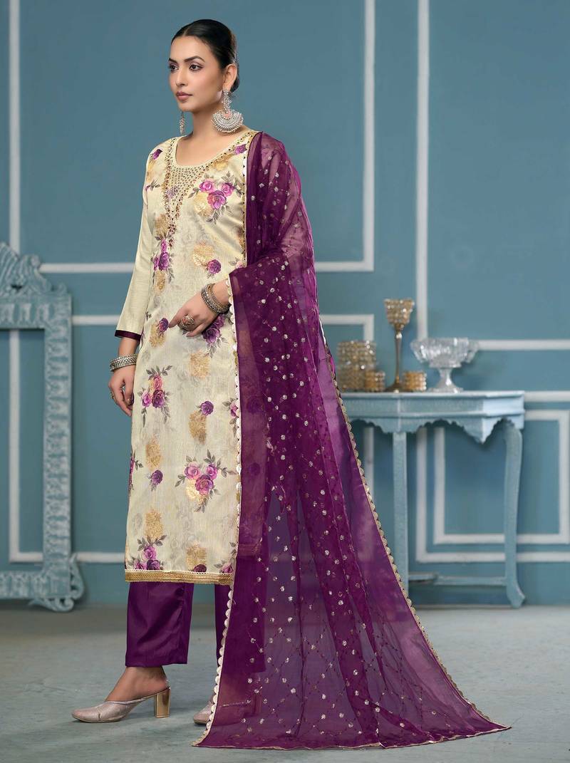 | Product Description | Office Ready Designer Print, Hand Work And Fancy Border With Embroidered Dupatta Straight Style 2.00 Mtr Unstitched Dress Material Top Of Multi Colour Viscose Banarasi Fabric With 2 Mtr Dull Santoon As Lining Inner Fabric Also Including 3.80 Mtr Unstiched Bottom Material Of Deep Voilet Colour Dull Santoon Fabric With 2.10 Mtr Dupatta Of Deep Voilet Colour Organza Fabric By Shadow & Saining Brand |