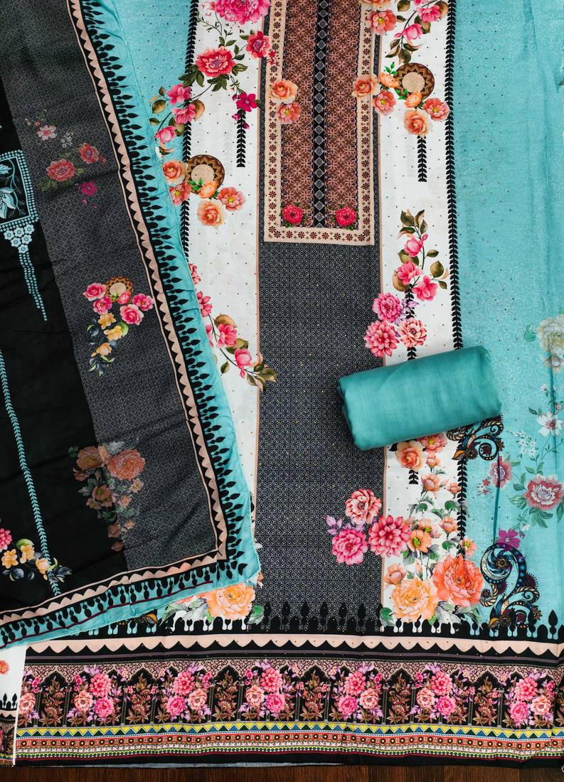 | Product Description | Handcrafted Designer Print And Daimond Siroski Work With Stylish Printed Dupatta Straight Style 2.00 Mtr Unstitched Dress Material Top Of Multi Colour Muslin Cotton Fabric Also Including 2.00 Mtr Chudidar Style Bottom Piece Material Of Sky Blue Colour Rayon Fabric With 2.00 Mtr Dupatta Of Multi Colour Muslin Cotton Fabric By Shadow & Saining Brand |