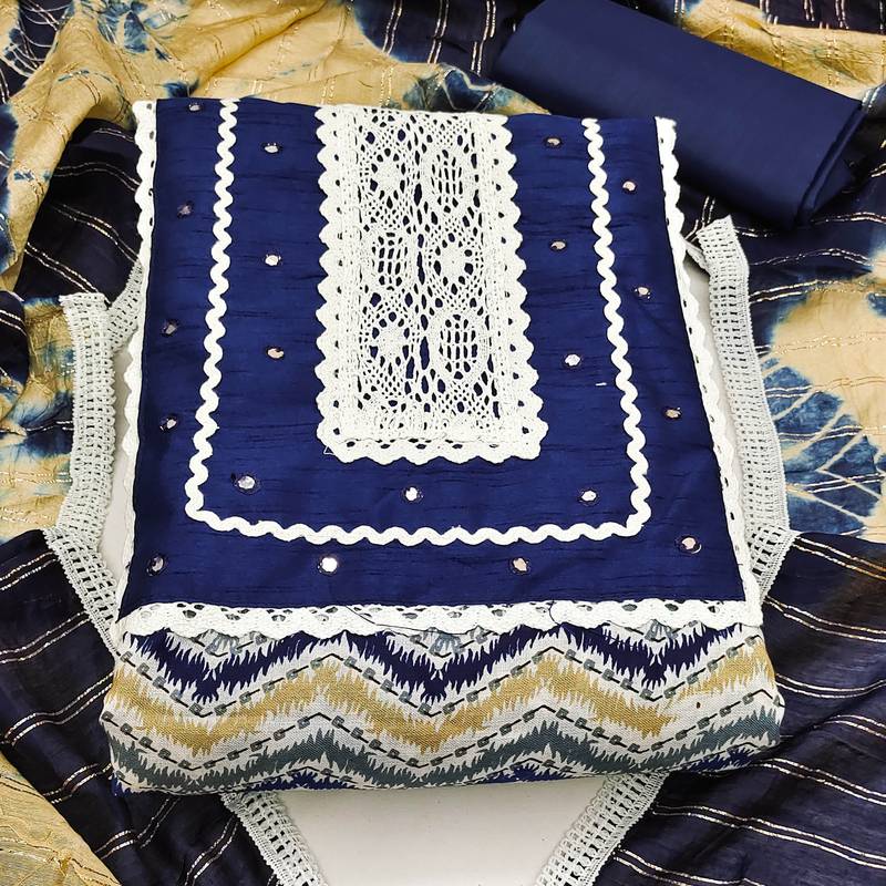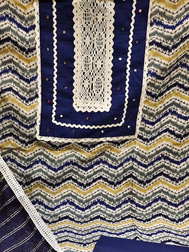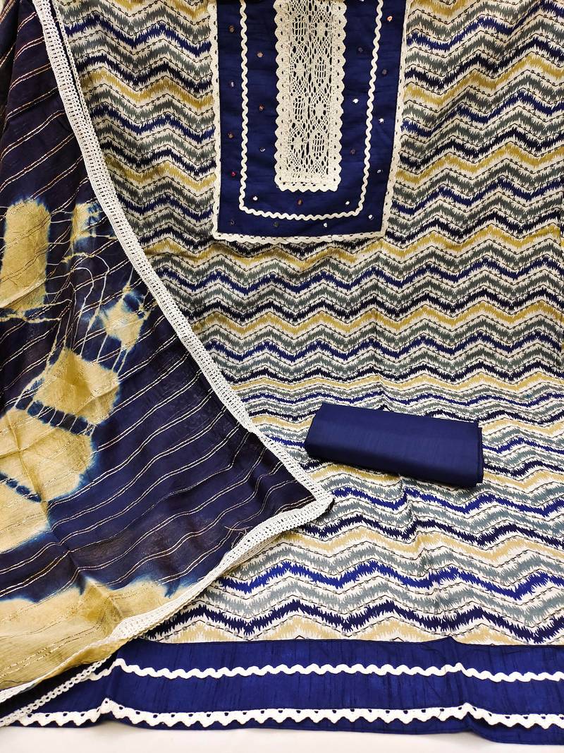 | Product Description | Print And Mirror Work With Fancy Border Straight Style 2.00 Mtr Unstitched Dress Material Top Of Multi Colour Cotton Fabric With 2.10 Mtr Unstitched Bottom Material Of Blue Colour Cotton Fabric With 2.00 Mtr Dupatta Of Multi Colour Cotton Fabric |