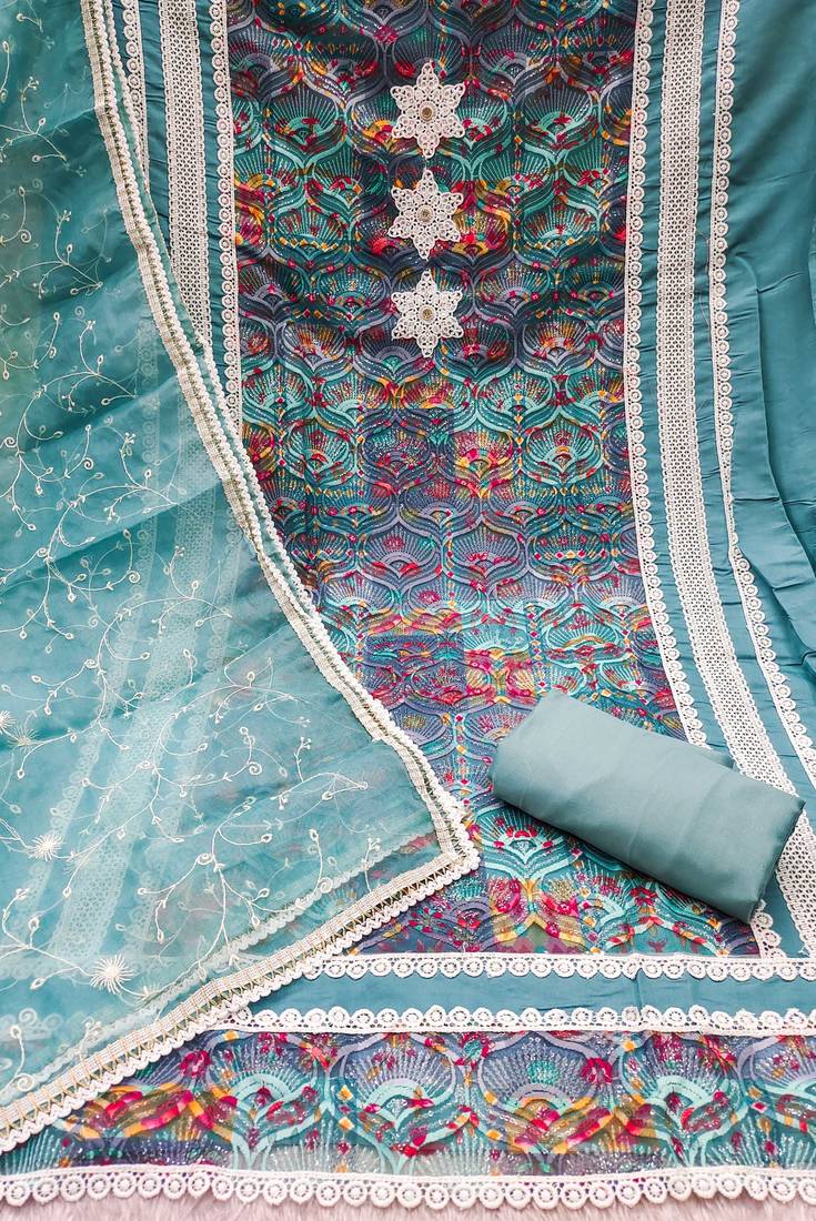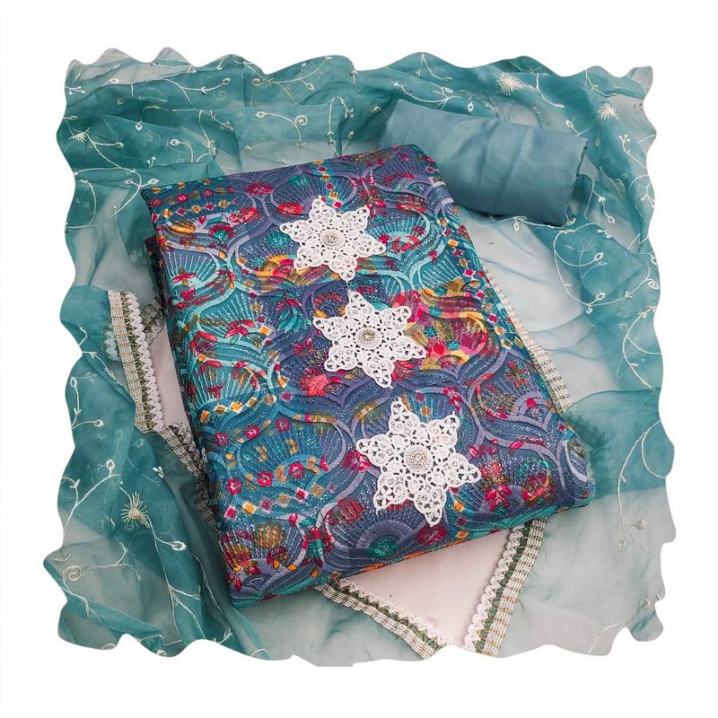 | Product Description | Skin Friendly Heavy Thread Sequence Embroidery Stylish Print And Fancy Border With Designer Embroidered Dupatta Straight Style 2.00 Mtr Unstitched Dress Material Top Of Multi Colour Roman Cotton Silk Fabric Also Including 2.40 Mtr Chudidar Style Bottom Piece Material Of Sea Green Colour Dull Santoon Fabric With 2.10 Mtr Dupatta Of Sea Green Colour Nazneen Fabric By Shadow & Saining Brand |