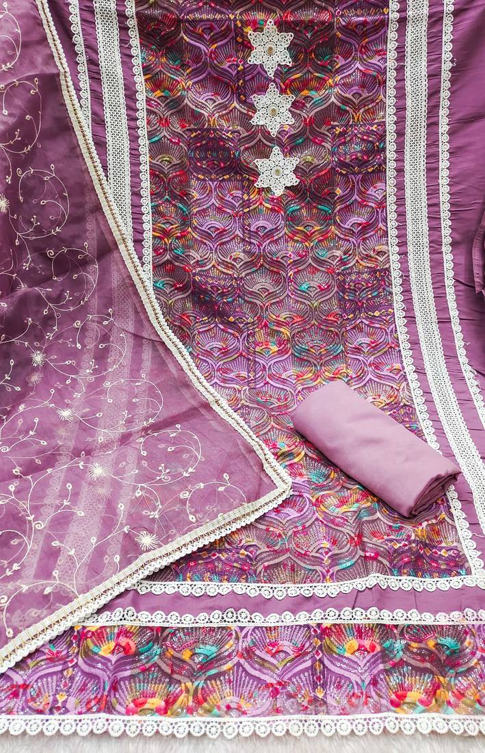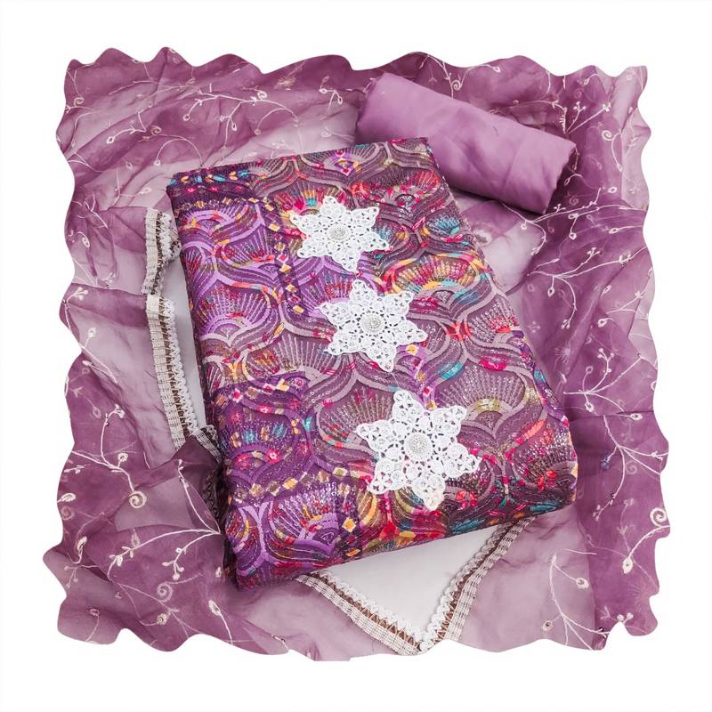 | Product Description | Wrinkle Resistant Heavy Thread Sequence Embroidery Stylish Print And Fancy Border With Designer Embroidered Dupatta Straight Style 2.00 Mtr Unstitched Dress Material Top Of Multi Colour Roman Cotton Silk Fabric Also Including 2.40 Mtr Chudidar Style Bottom Piece Material Of Levender Colour Dull Santoon Fabric With 2.10 Mtr Dupatta Of Levender Colour Nazneen Fabric By Shadow & Saining Brand |