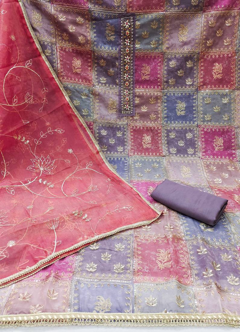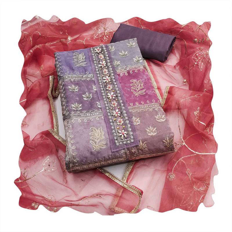 | Product Description | Handcrafted Heavy Thread Sequence Embroidery And Fancy Border With Designer Embroidered Dupatta Straight Style 2.00 Mtr Unstitched Dress Material Top Of Multi Colour Viscose Organja Fabric With 2 Mtr Dull Santoon As Lining Inner Fabric Also Including 3.80 Mtr Unstiched Bottom Material Of Purple Colour Dull Santoon Fabric With 2.10 Mtr Dupatta Of Purple Colour Organja Fabric By Shadow & Saining Brand |