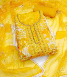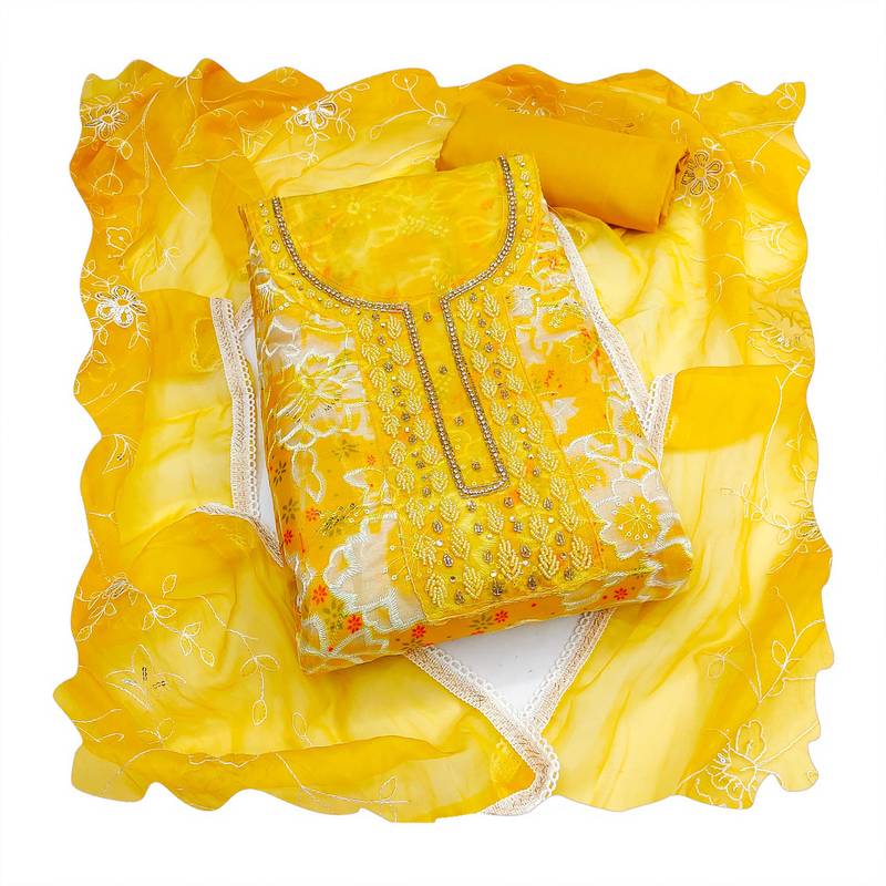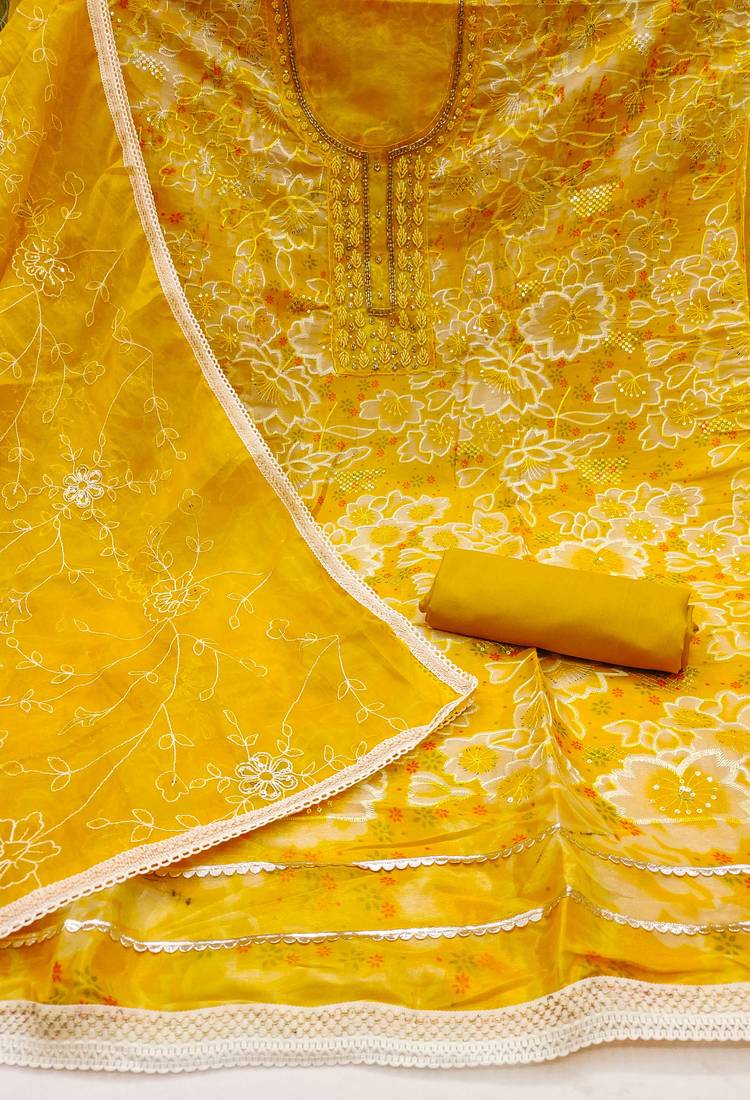Elegant Heavy Thread Sequence Digital Position Print Embroidery Handwork Neck And Fancy Border With Designer Embroidered Dupatta Straight Style 2.00 Mtr Unstitched Dress Material Top Of Multi Colour Organja Fabric With 2 Mtr Dull Santoon As Lining Inner Fabric Also Including 3.80 Mtr Unstiched Bottom Material Of Yellow Colour Dull Santoon Fabric With 2.10 Mtr Dupatta Of Yellow Colour Organja Fabric By Shadow & Saining Brand
