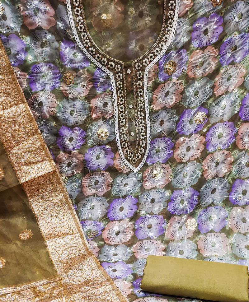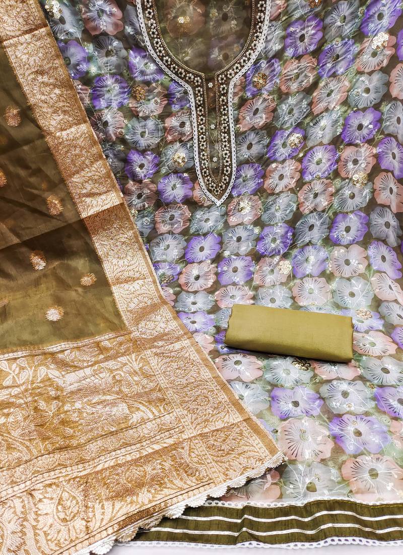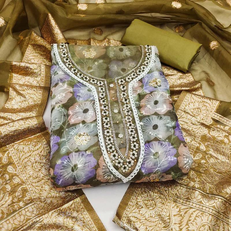 | Product Description | Fancy Handwork Sequin Work Position Print Work And Border With Weaving Dupatta Straight Style 2.00 Mtr Unstitched Dress Material Top Of Multi Colour Organza Fabric With 2 Mtr Santoon As Lining Inner Fabric Also Including 3.80 Mtr Unstitched Bottom Material Of Olive Green Colour Santoon Fabric With 2.00 Mtr Dupatta Of Olive Green Colour Organza Banarasi Fabric |