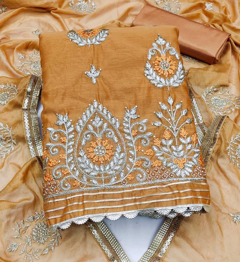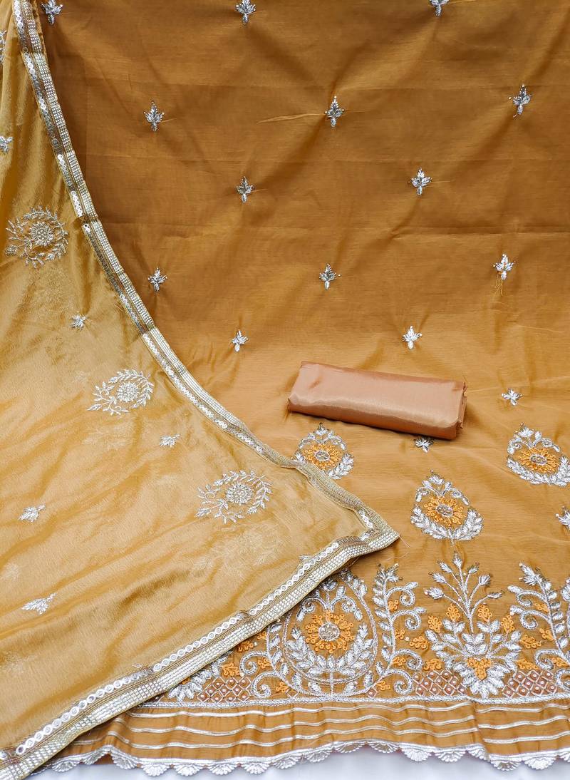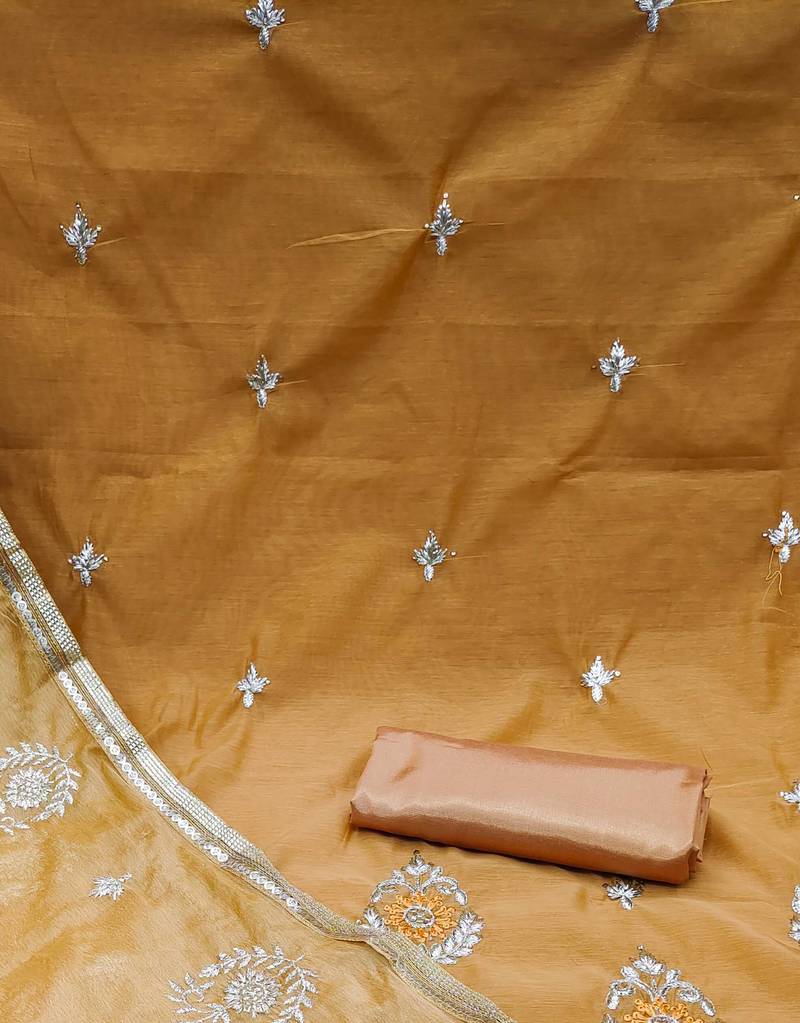Mustard chanderi embroidered dress material unstitched