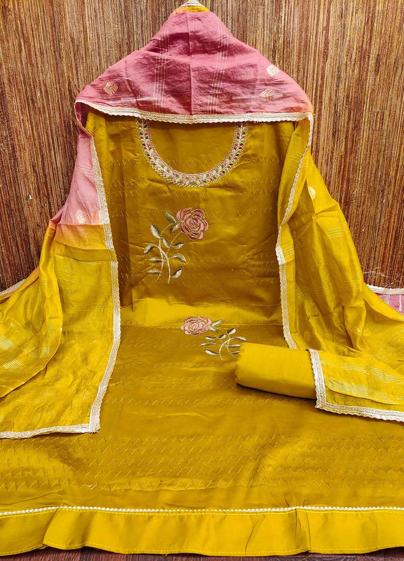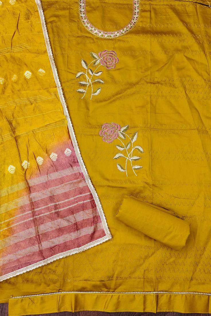 | Product Description | Handcrafted Heavy Thread Daimond Embroidery And Fancy Border With Designer Weaving Dupatta Straight Style 2.00 Mtr Unstitched Dress Material Top Of Mustered Colour Jaam Cotton Fabric Also Including 2.00 Mtr Chudidar Style Bottom Piece Material Of Mustered Colour Cotton Fabric With 2.00 Mtr Dupatta Of Multi Colour Chanderi Cotton Fabric By Shadow & Saining Brand |