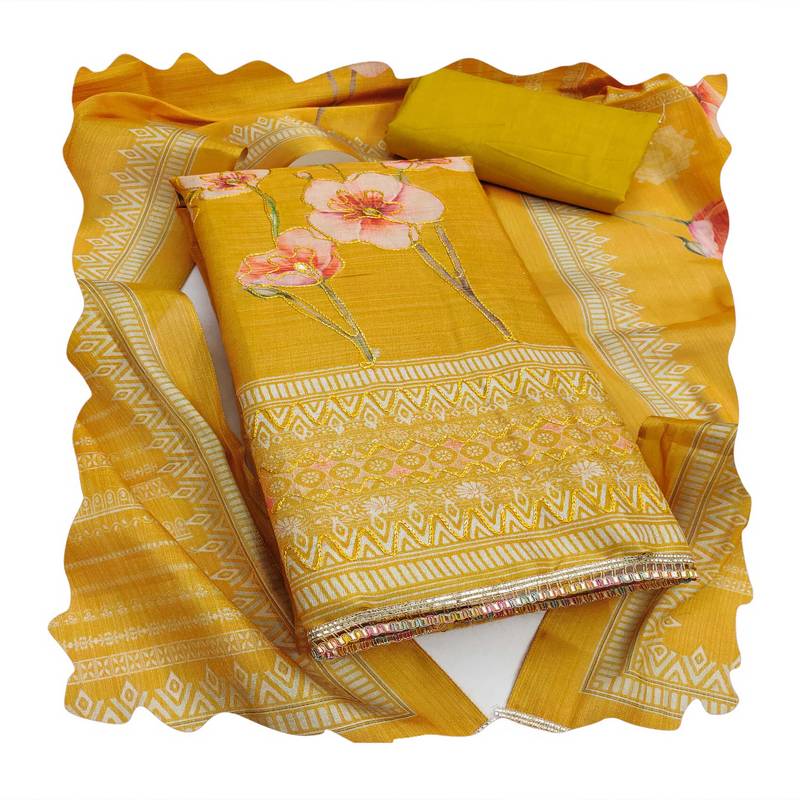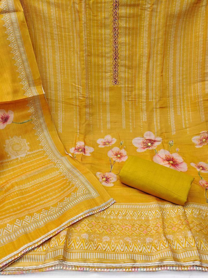 | Product Description | Luxury Designer Printed Embroidery And Fancy Border With Stylish Printed Dupatta Straight Style 2.20 Mtr Unstitched Dress Material Top Of Mustard Colour Simmer Cotton Silk Fabric Also Including 2.40 Mtr Chudidar Style Bottom Piece Material Of Mustard Colour Rayon Fabric With 2.10 Mtr Dupatta Of Mustard Colour Simmer Cotton Silk Fabric By Shadow & Saining Brand |